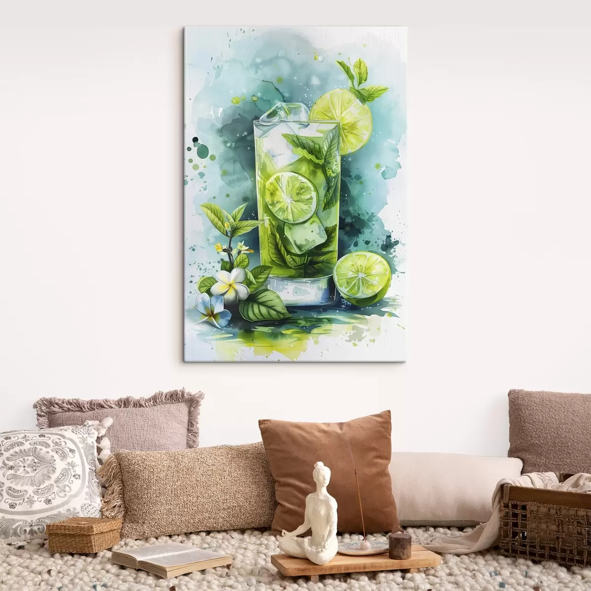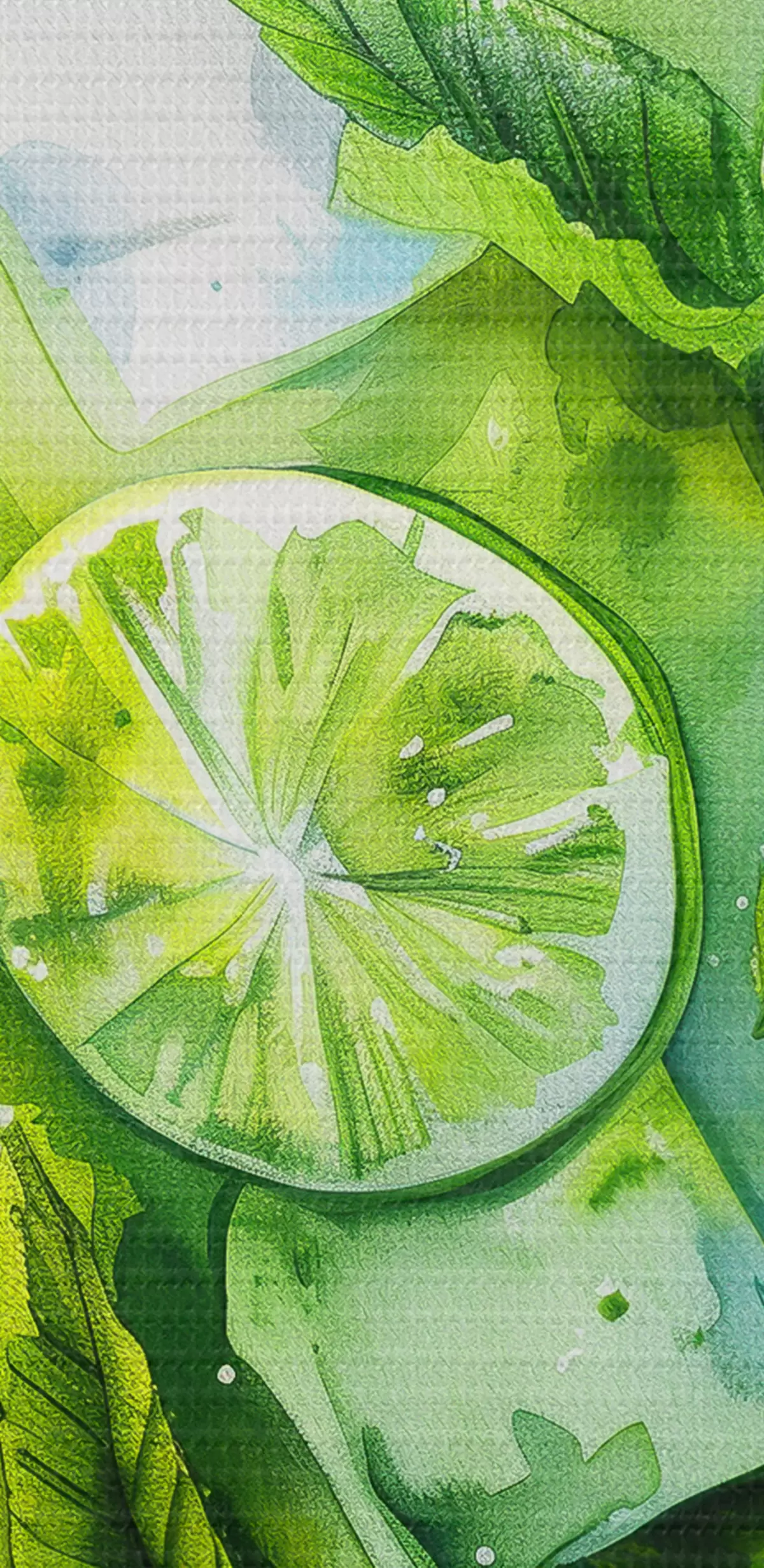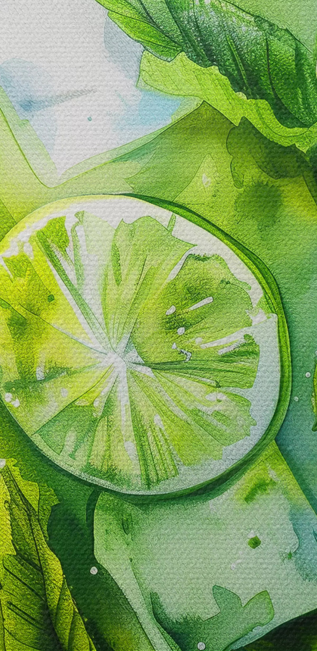 Paveikslas Vasarinis akvarelės kokteilis, mojito, laimo ir mėtų, gėlių, žalios spalvos Nr s39712