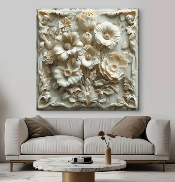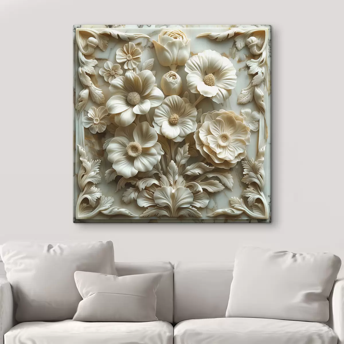 Paveikslas 3D baltos bareljefinės gėlės su marmuriniame fone su rėmeliu Nr s39739