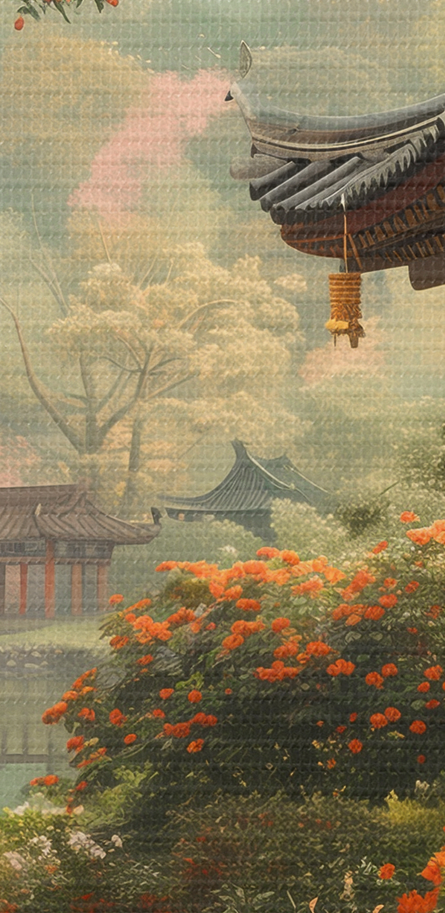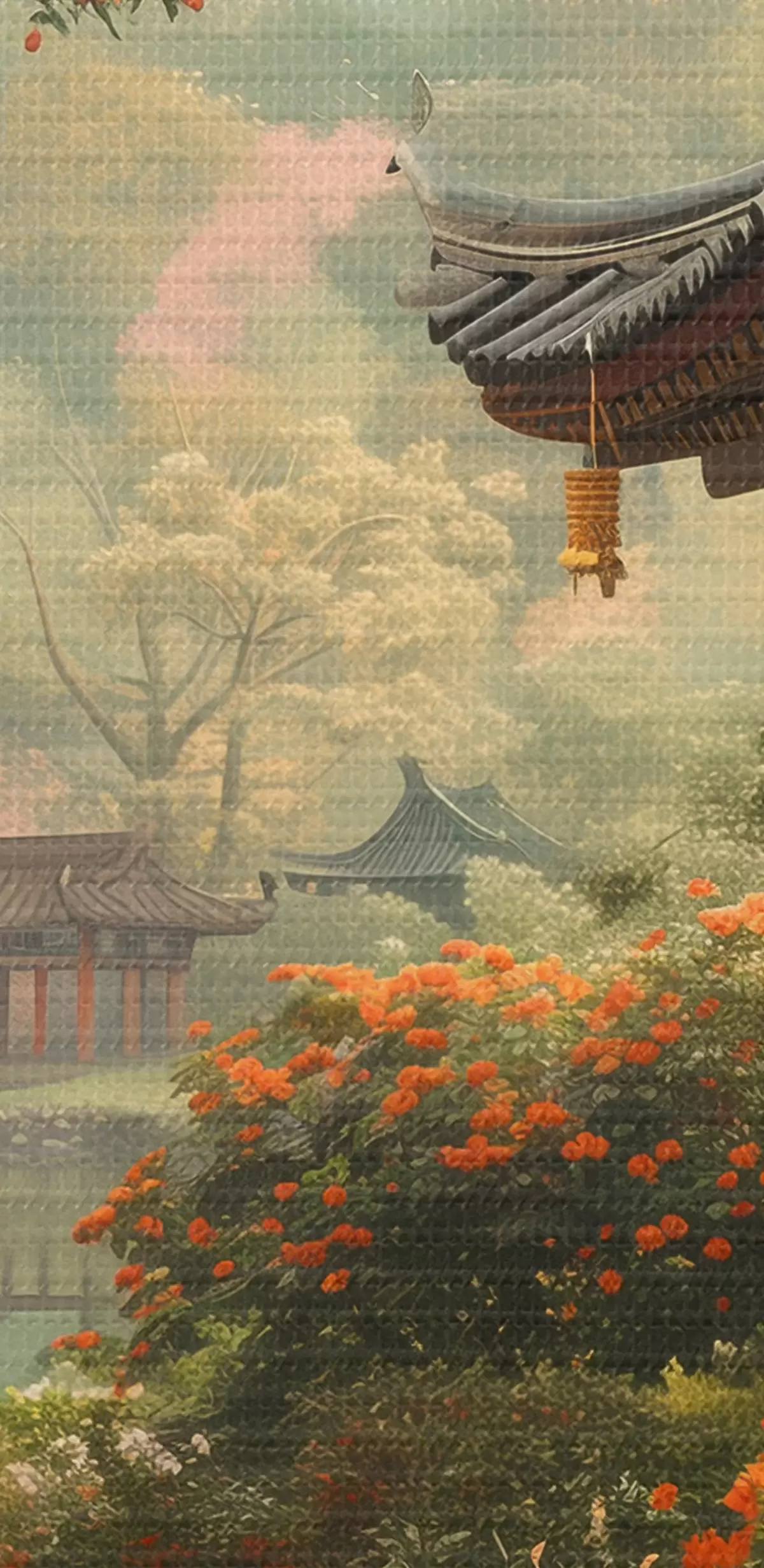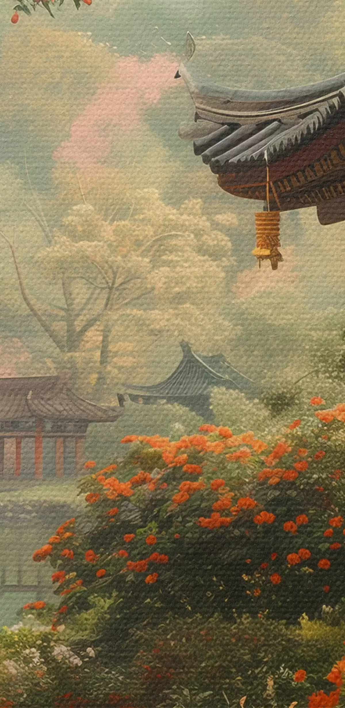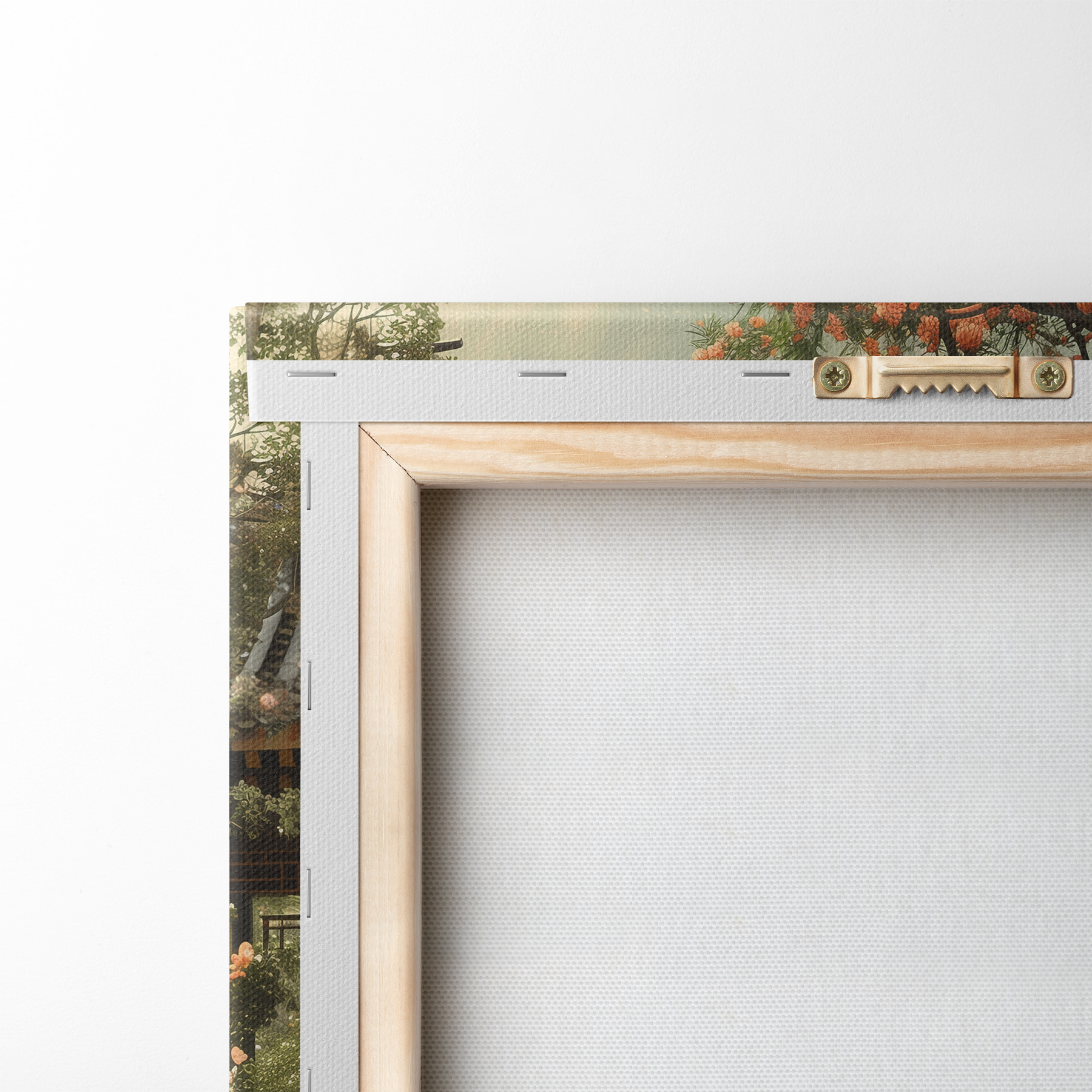 Paveikslas Japoniškas parkas su žydinčiais medžiais ir gėlėmis, miškas, sodo namelis, ežeras Nr s39772