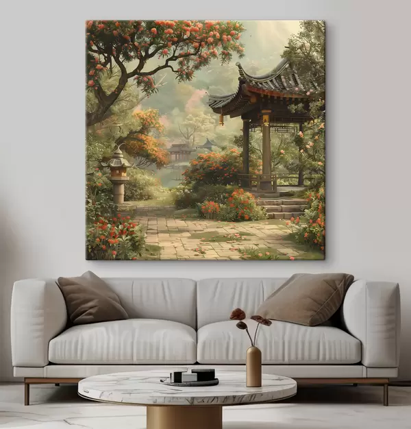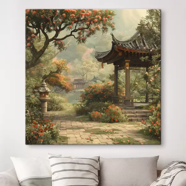 Paveikslas Japoniškas parkas su žydinčiais medžiais ir gėlėmis, miškas, sodo namelis, ežeras Nr s39772