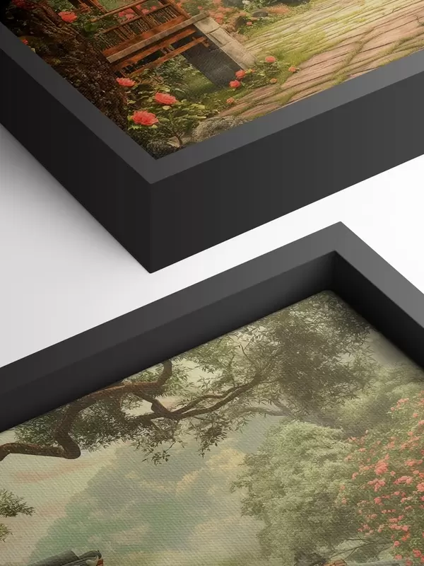 Paveikslas Japoniškas parkas su žydinčiais medžiais ir gėlėmis, miškas, medinis namas Nr s39773