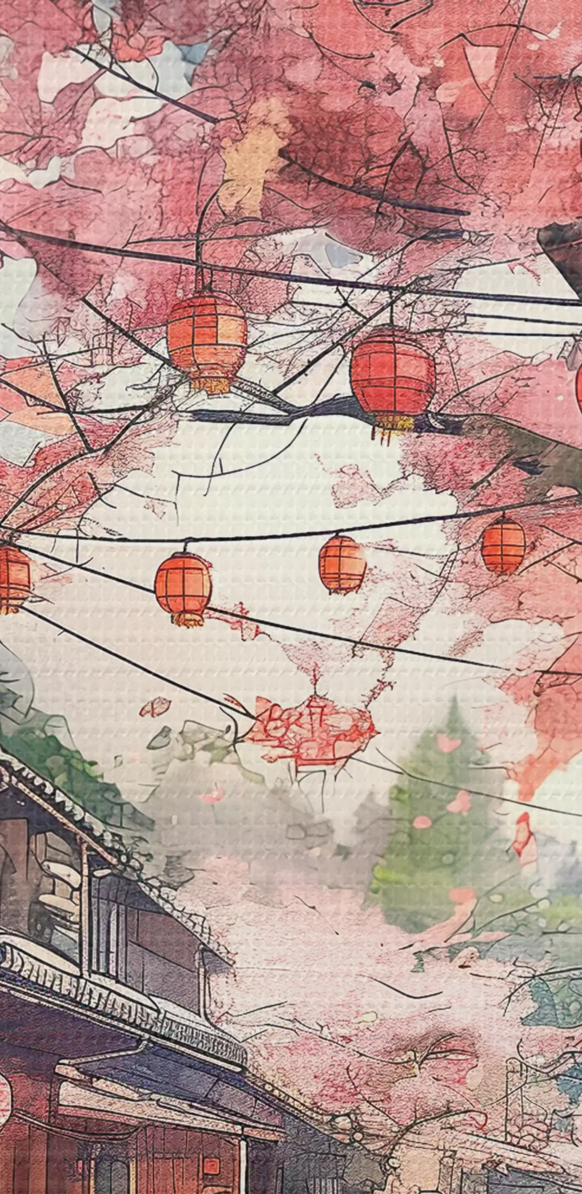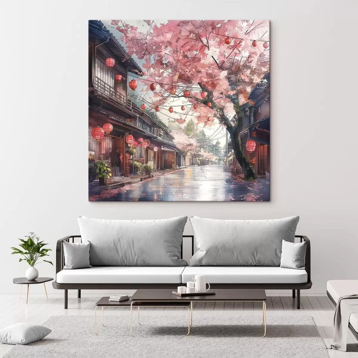 Paveikslas Japoniška gatvė su žydinčiomis vyšniomis, rytietiška architektūra, žibintais Nr s39774