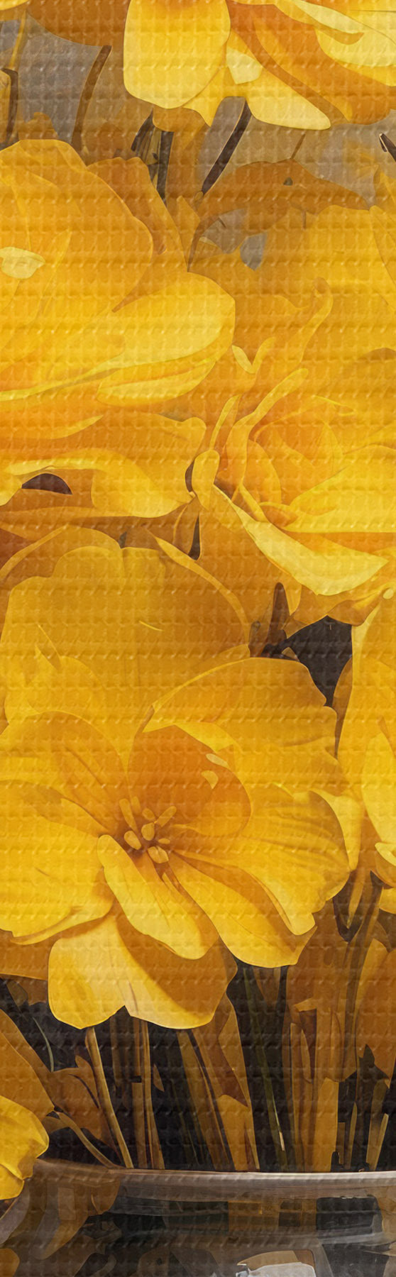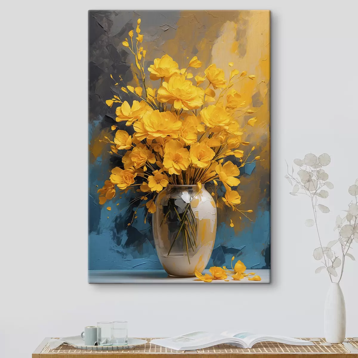 Paveikslas Geltonos gėlės vazoje įvairiaspalviame akrilo fone Nr s39854