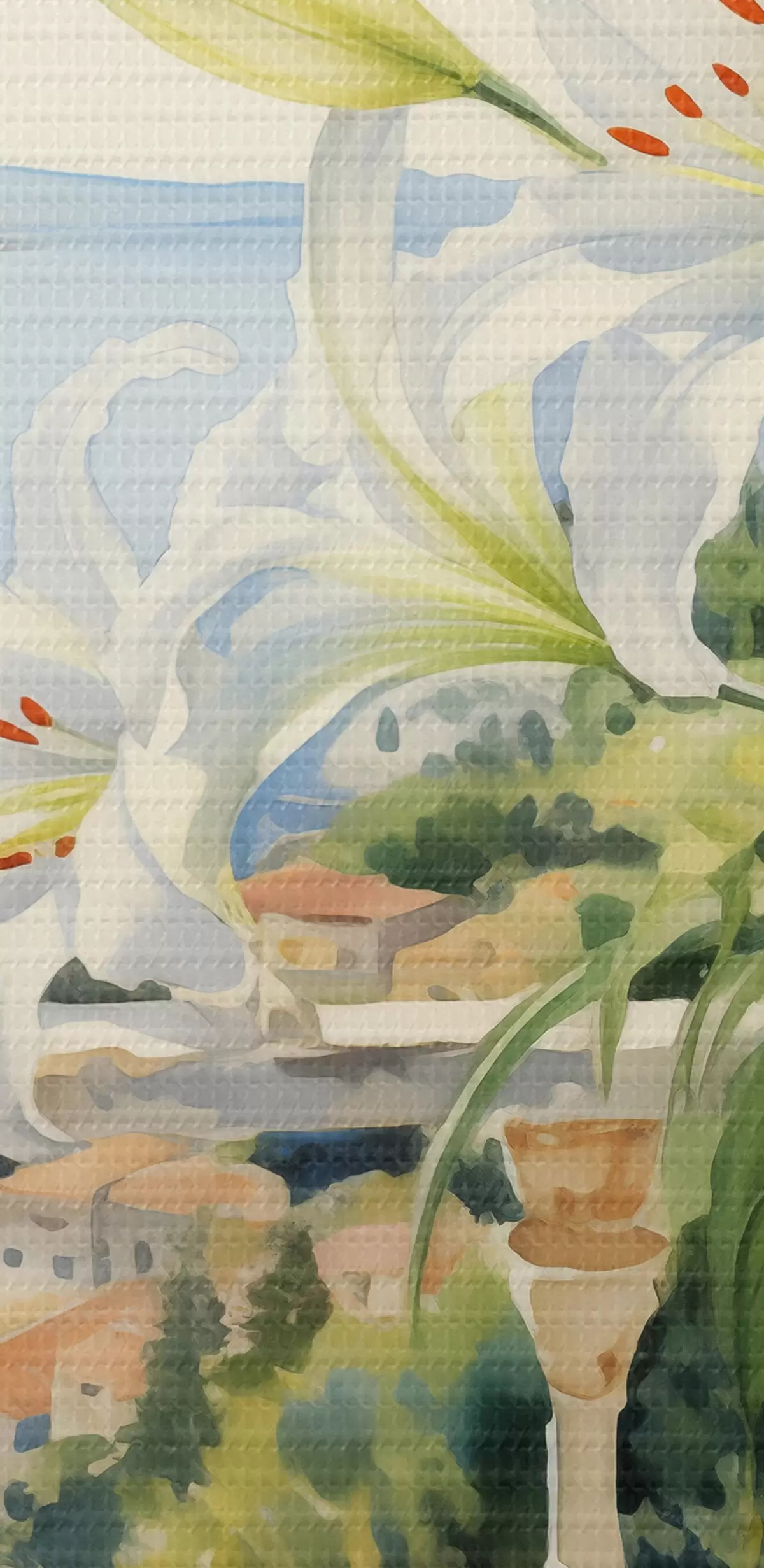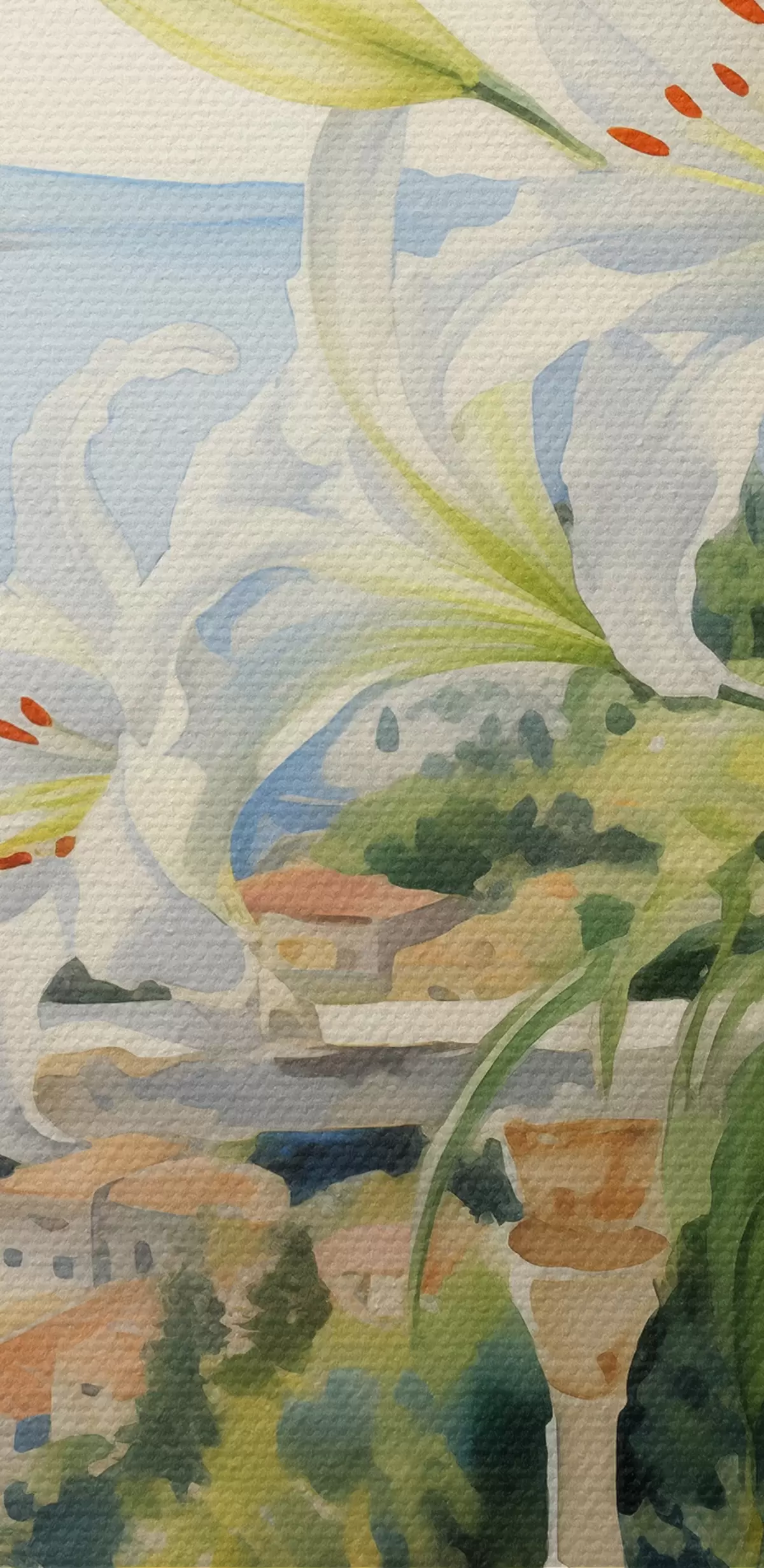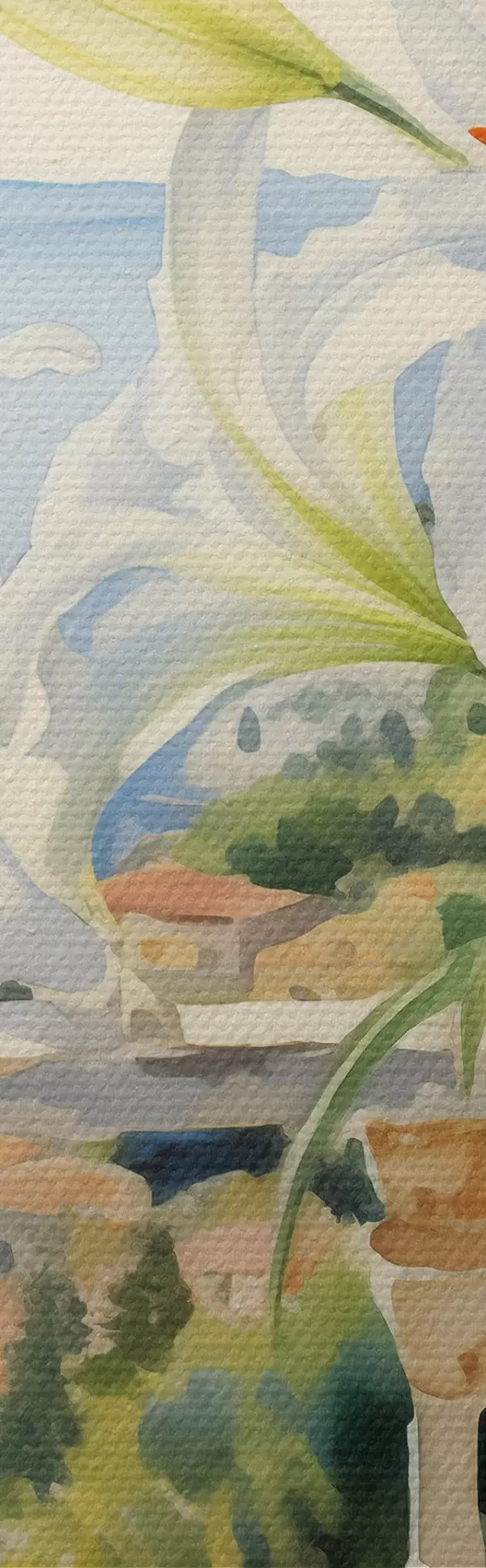 Paveikslas Baltos lelijos vazonėlyje balkone įlankos akvarelės fone Nr s39932