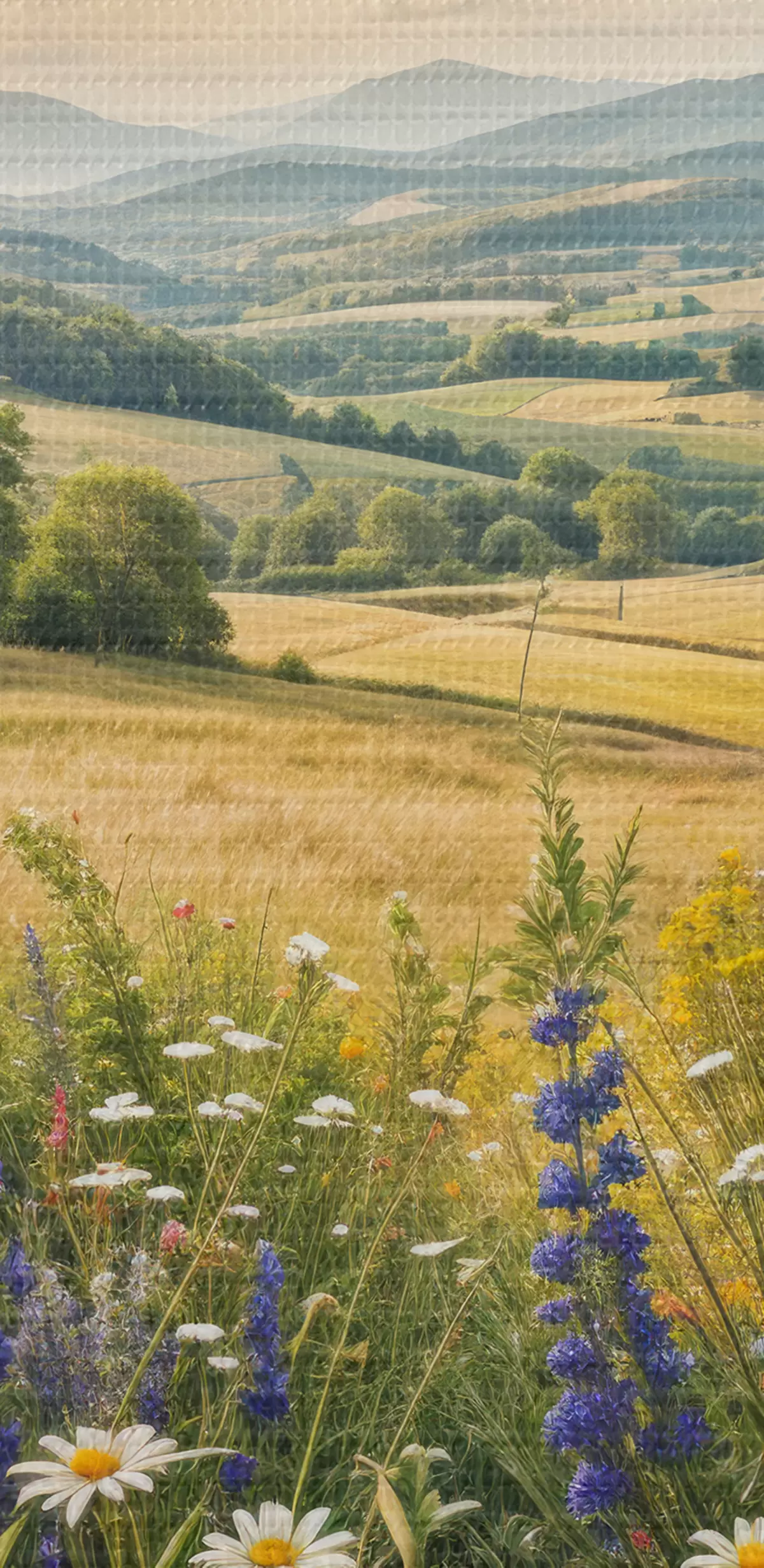Paveikslas Vešlus kaimo kraštovaizdis su gyvybinga lauko gėlių pieva, užpildyta spalvingomis gėlėmis po debesuotu dangumi Nr s40018