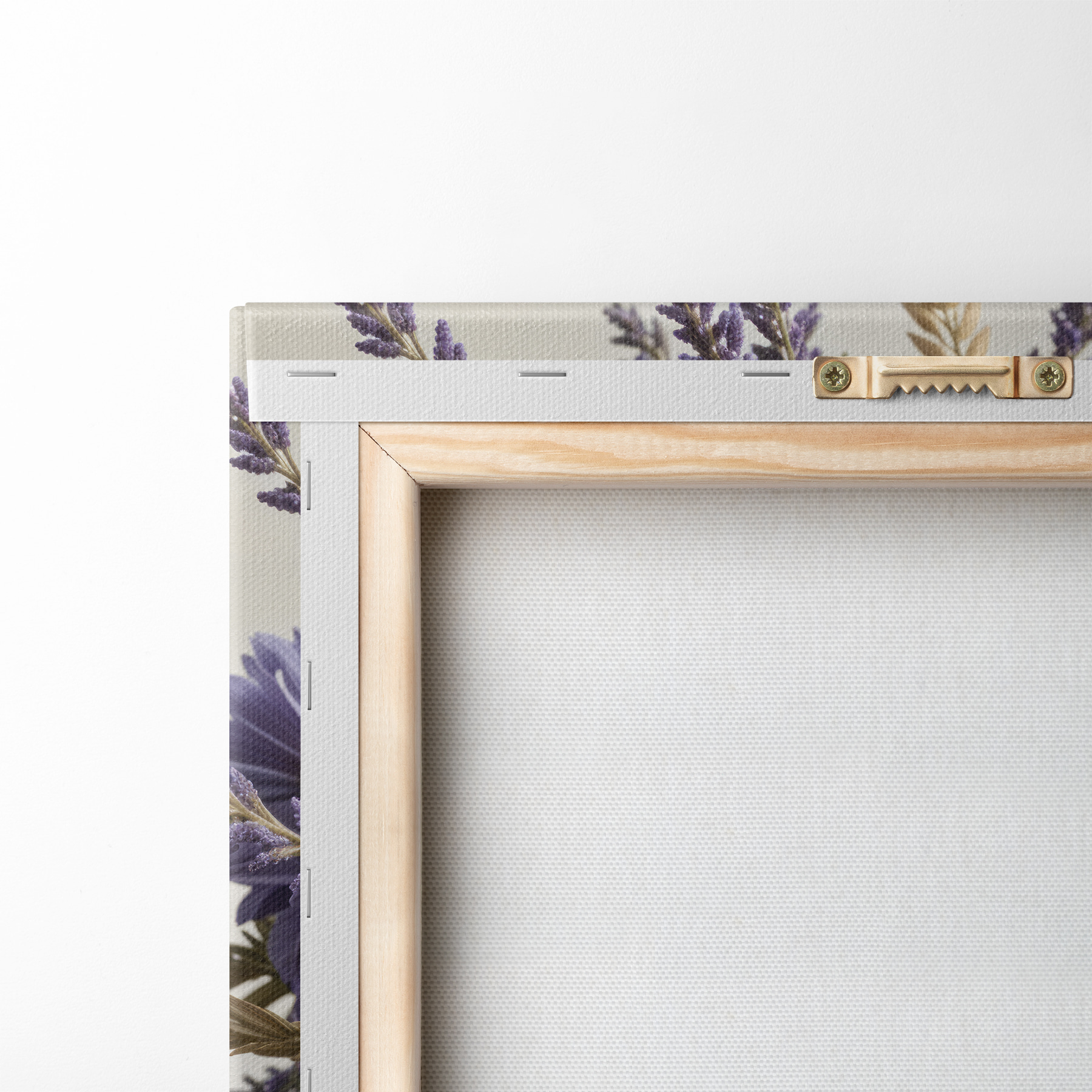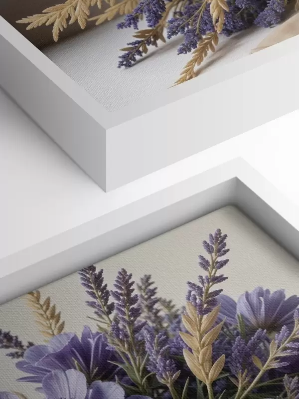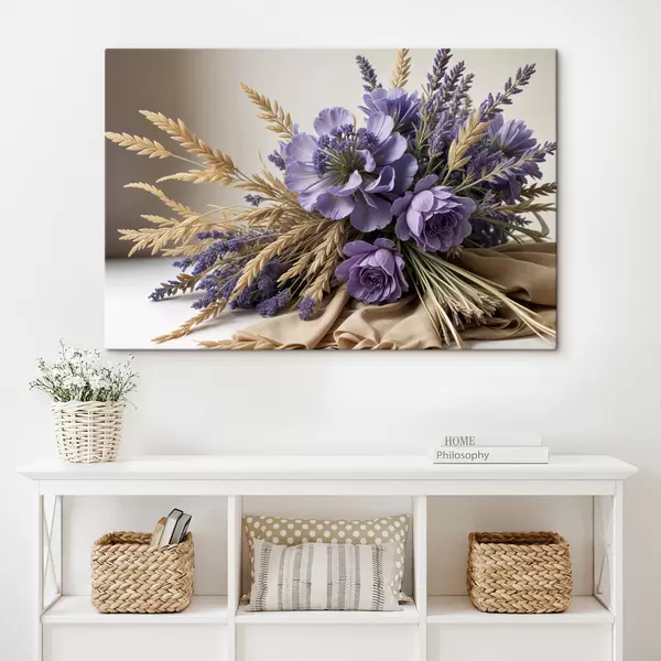Paveikslas Violetinių gėlių puokštė, įskaitant bijūnus ir levandas, su kviečių stiebais šviesiame fone Nr s40030