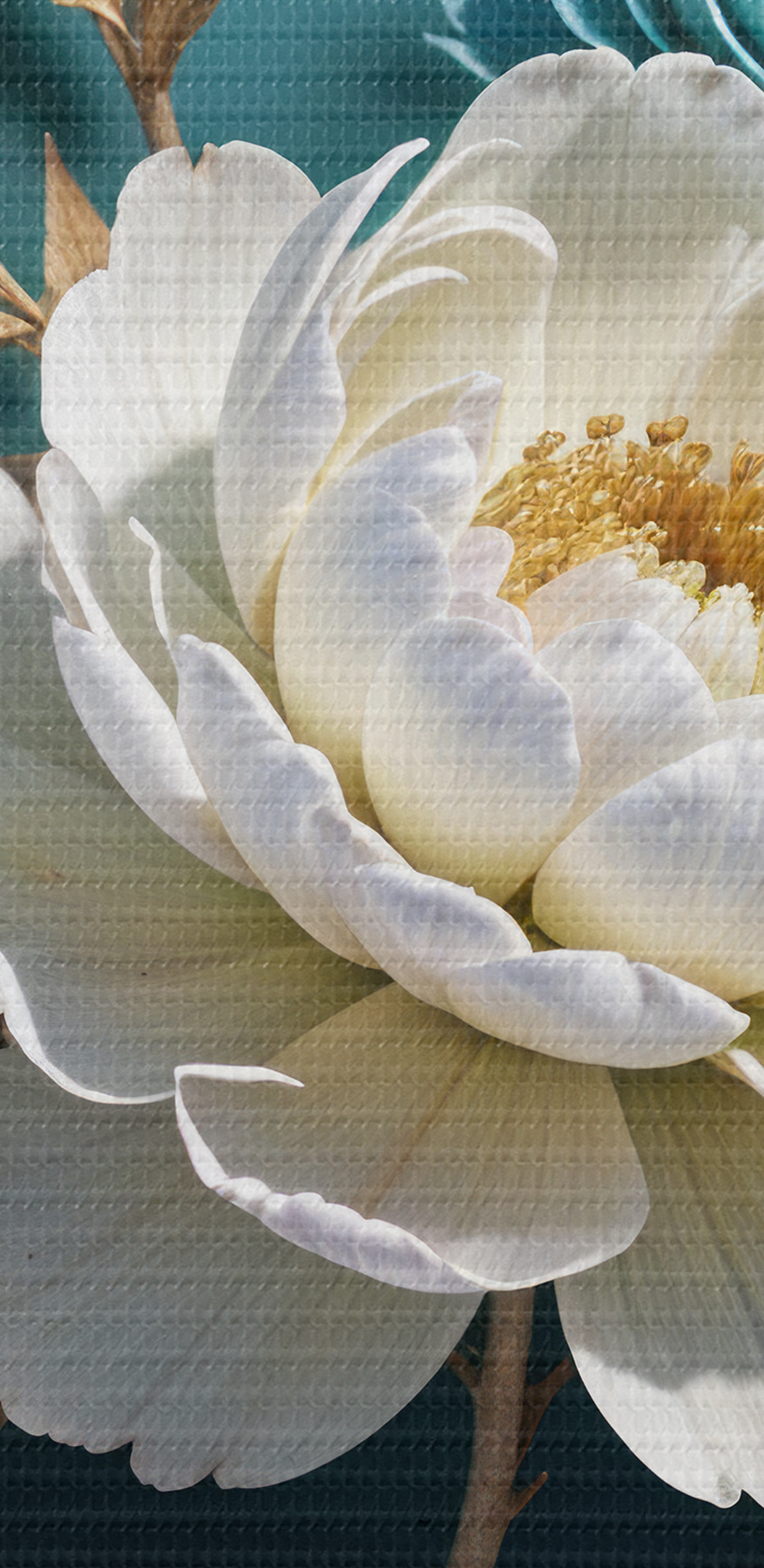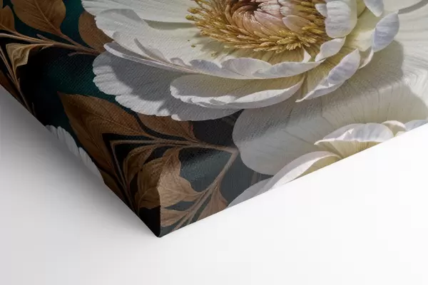 Paveikslas Didelių baltų ir melsvai žalių bijūnų gėlių puokštė geltonais lapais žalsvai melsvos spalvos fone Nr s40036