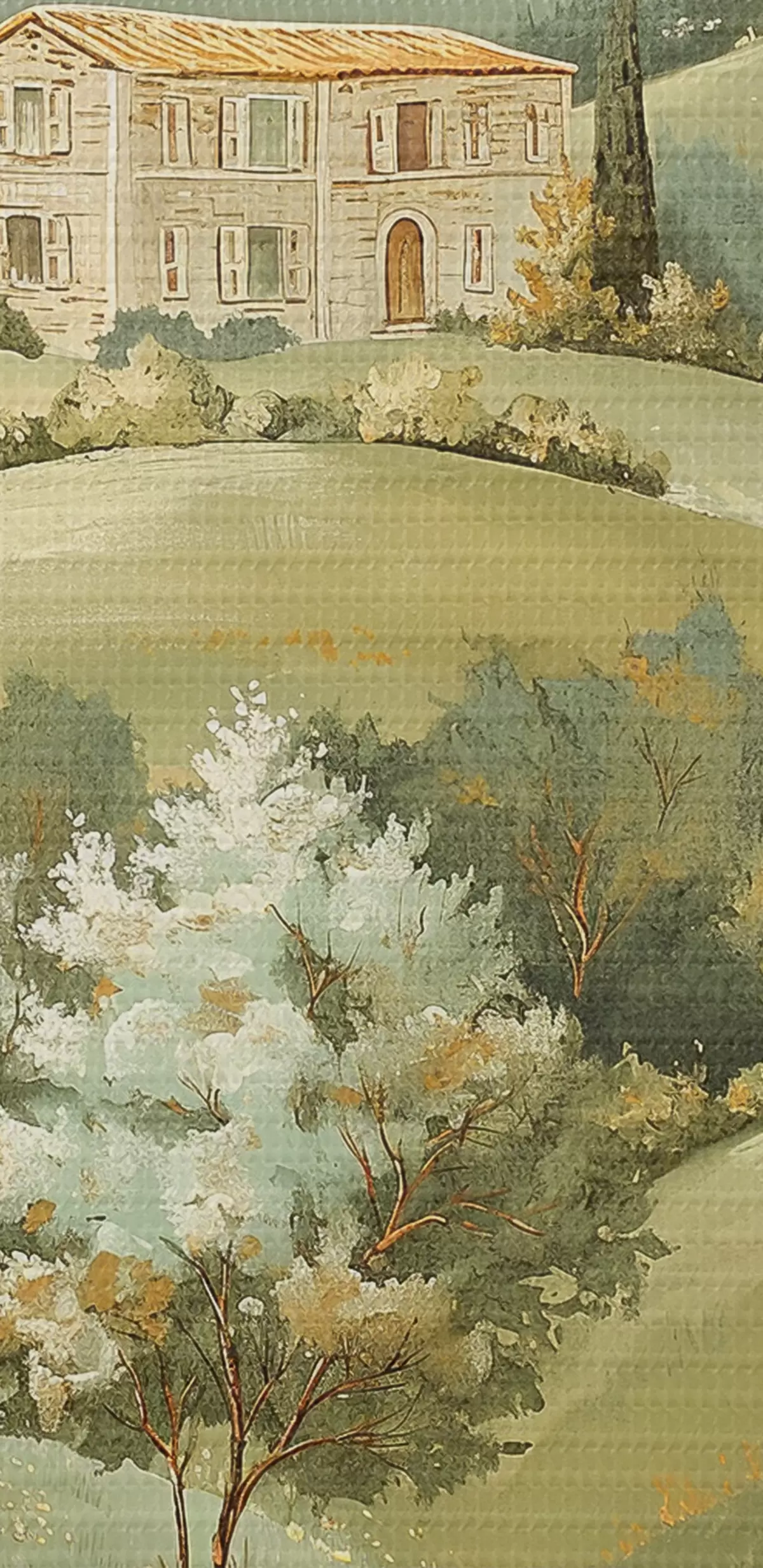 Paveikslas Peizažas su vintažiniais namais, pastelinės žalios spalvos, akrilo piešinys, vasara Nr s40078