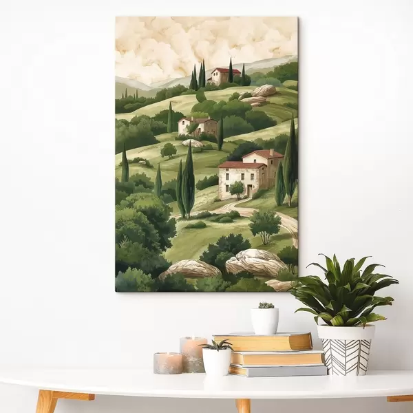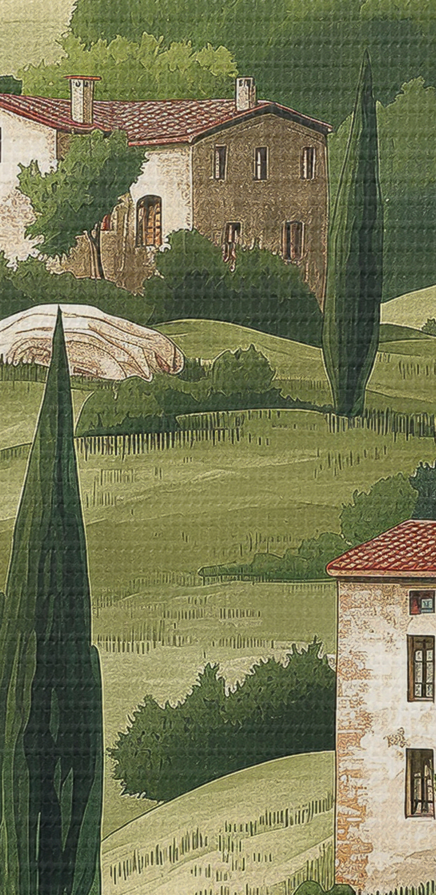 Paveikslas Peizažas su vintažiniais namais, pastelinės žalios spalvos, akrilo piešinys, kaimiškas Nr s40080