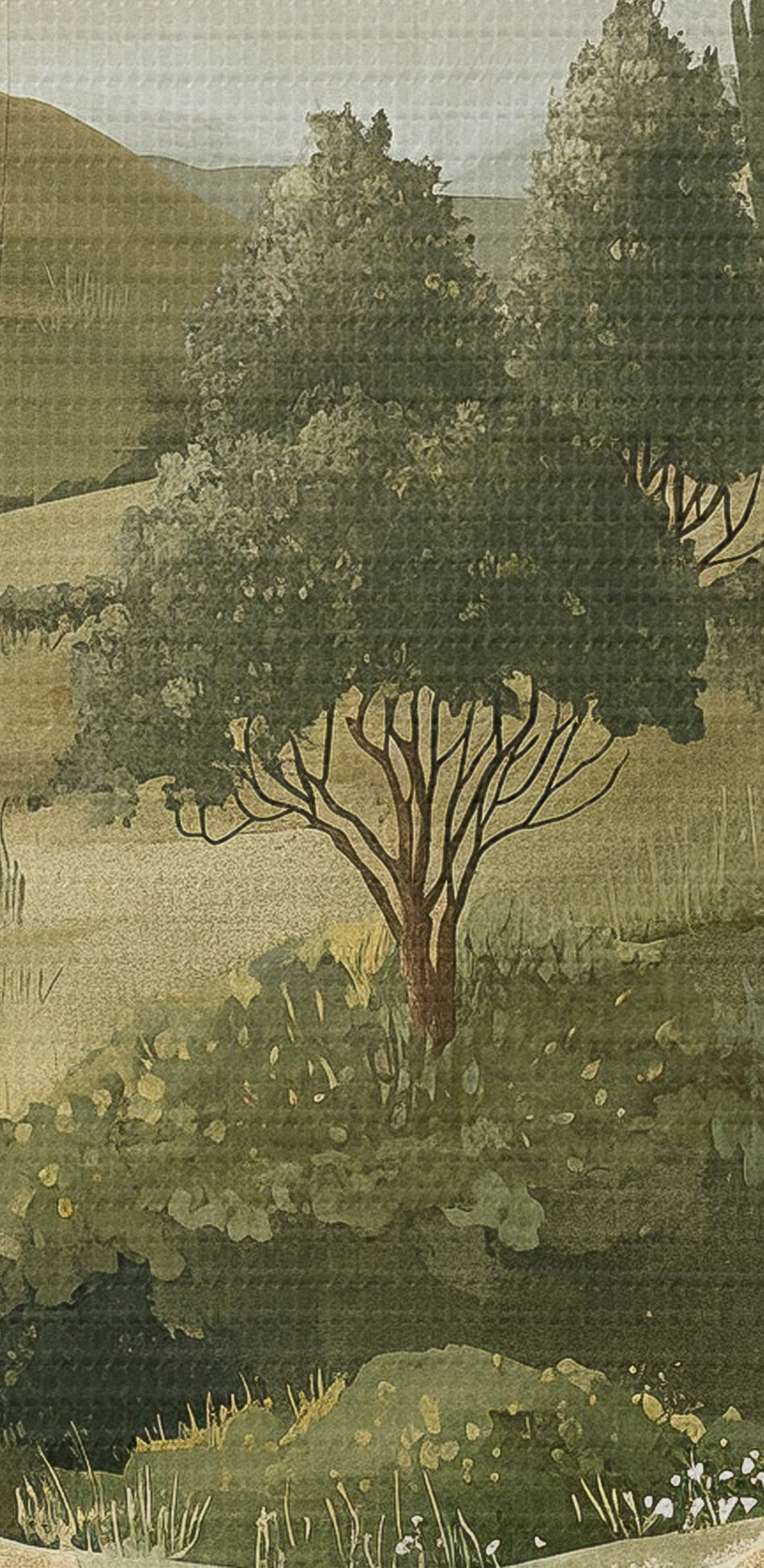 Paveikslas Vintažinis peizažas, kaimiškas stilius, pastelinės spalvos, pieva su gėlėmis ir medžiais Nr s40081