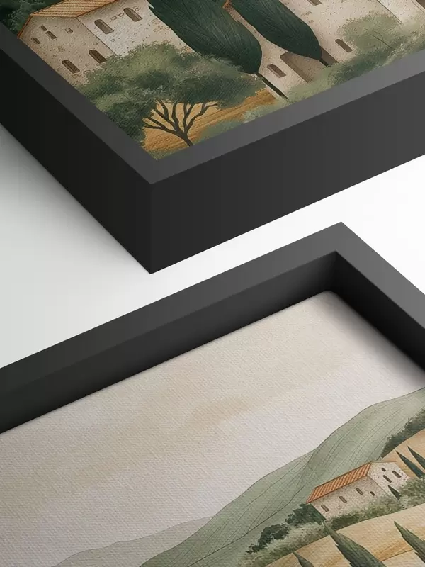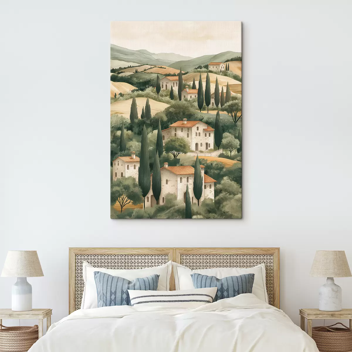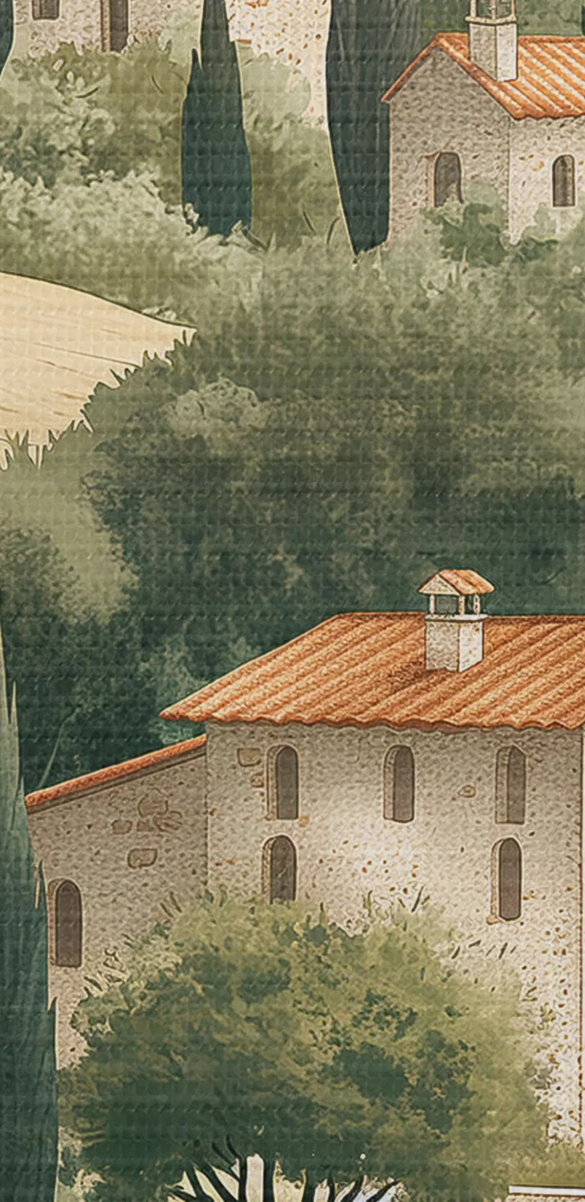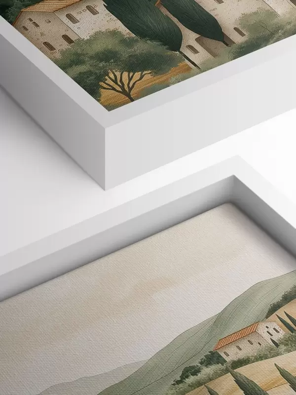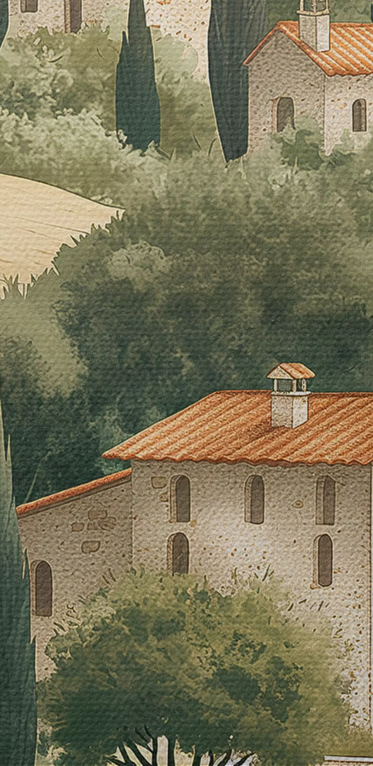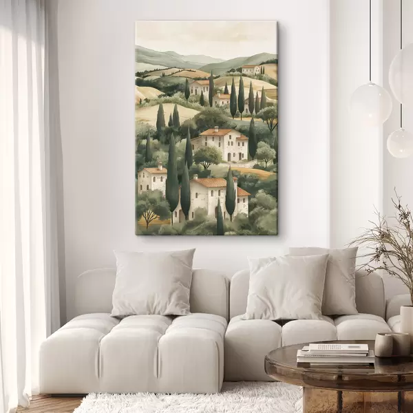 Paveikslas Toskanos kraštovaizdis su vintažiniais namais, pastelinėmis spalvomis, kalvomis ir medžiais, kaimiškas Nr s40082