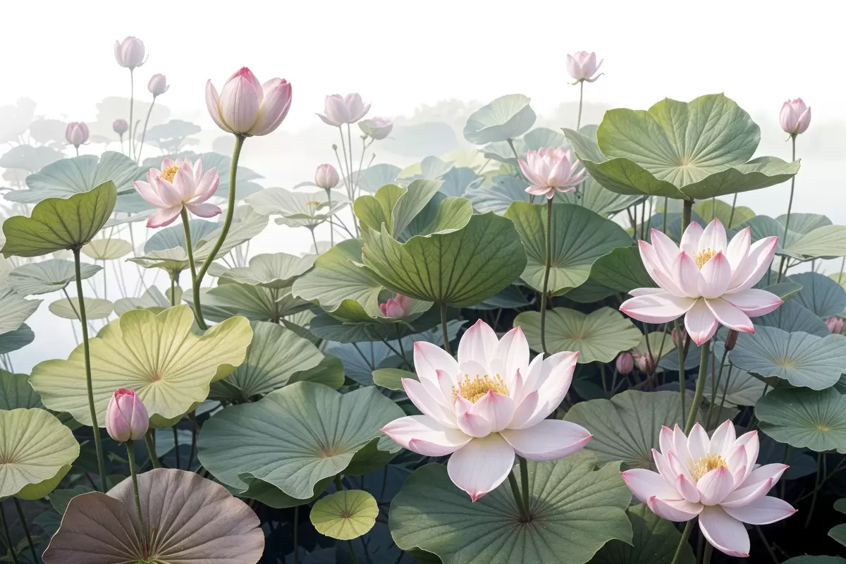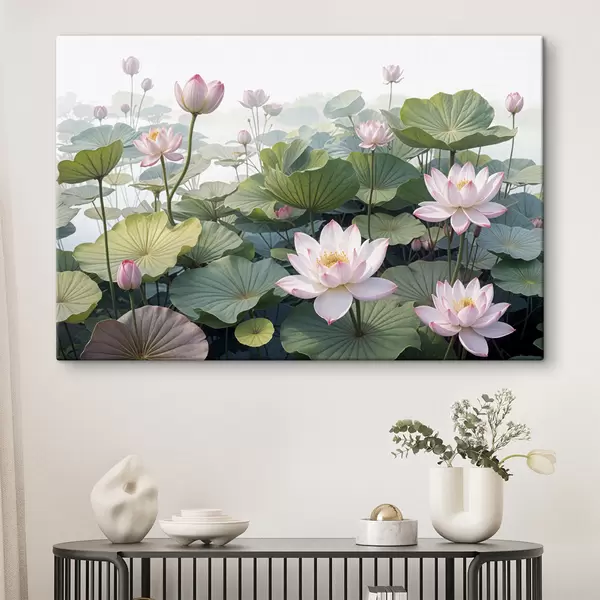 Paveikslas Vešlus tvenkinys, užpildytas ryškiomis rožinėmis ir baltomis lotoso gėlėmis, apsuptas didelių žalių lelijų trinkelių Nr s40145