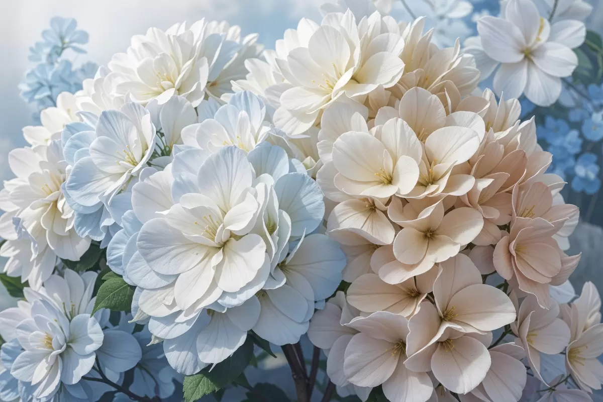 Paveikslas Švelnios, pastelinės spalvos jurginų gėlės su švelniais žiedlapiais, žydinčiais neryškiame fone Nr s40146