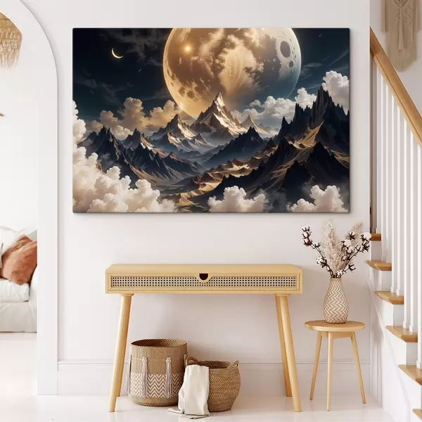 Paveikslas Siurrealistinis peizažas su snieguotais kalnais po didžiule pilnatis, su šmaikščiais debesimis Nr s40147
