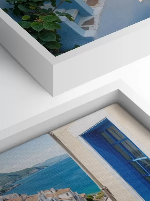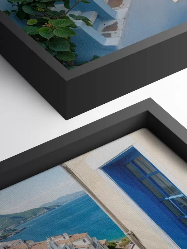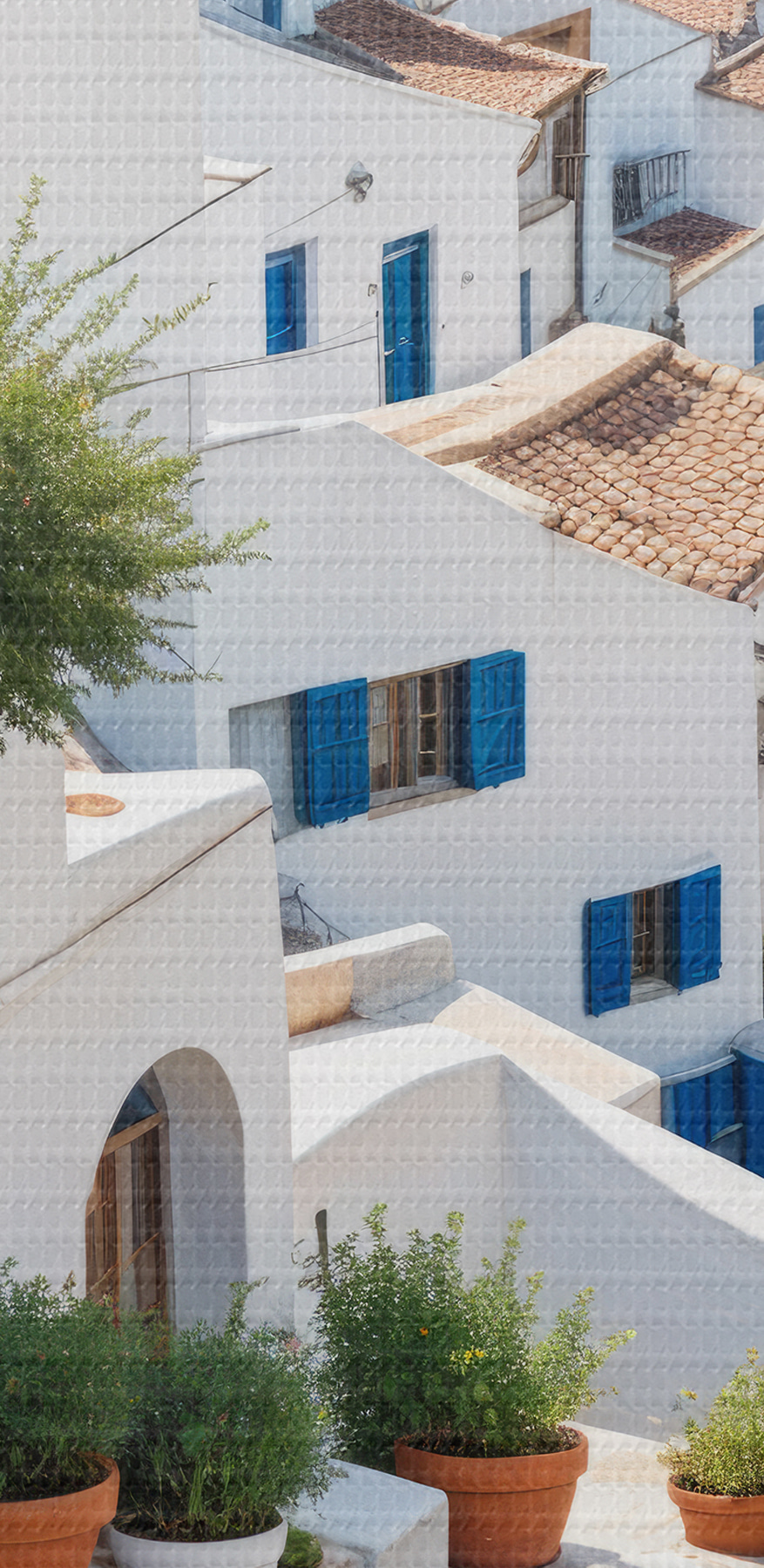 Paveikslas Vaizdingas pakrantės miestelis su baltais pastatais, mėlynais langais ir siauromis gatvelėmis išklotais vazoniniais augalais Nr s40148
