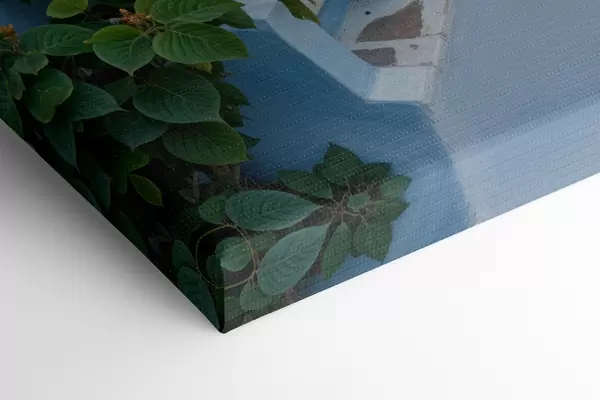 Paveikslas Vaizdingas pakrantės miestelis su baltais pastatais, mėlynais langais ir siauromis gatvelėmis išklotais vazoniniais augalais Nr s40148