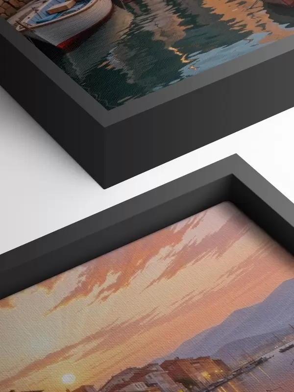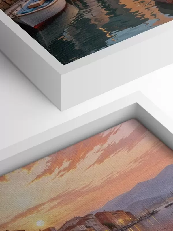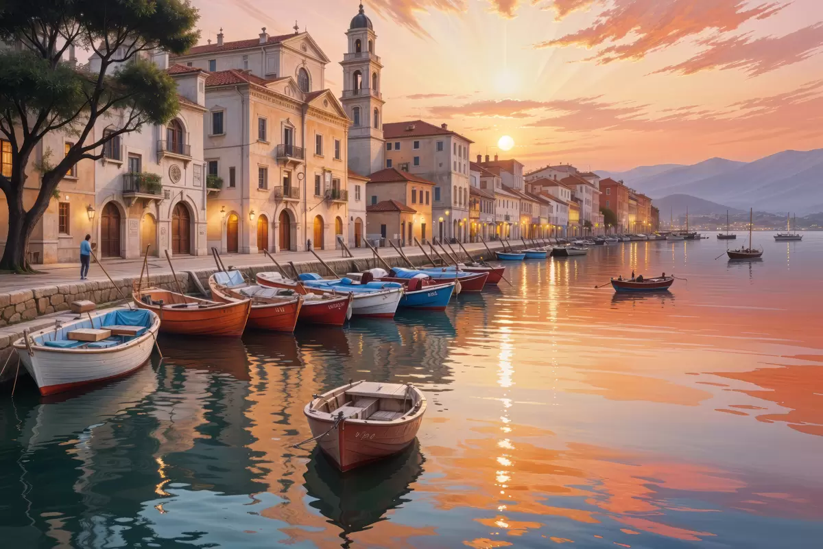 Paveikslas Italijos pakrantės miestelis saulėlydžio metu su spalvingais pastatais, išsidėsčiusiais pakrantėje ir valtimis plaukiojančiais ramiuose vandenyse Nr s40150