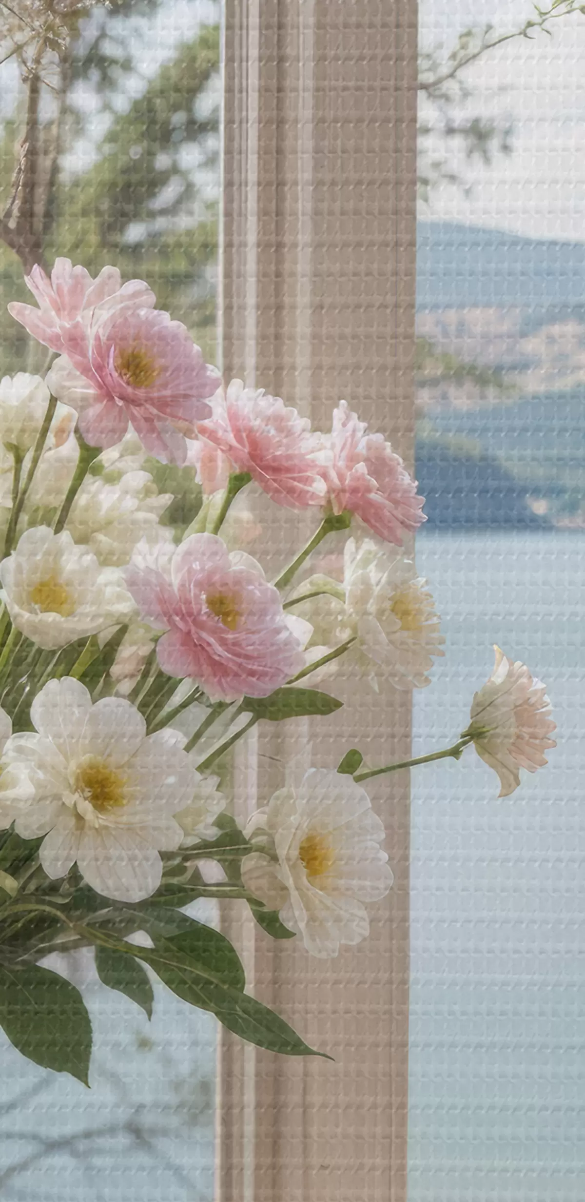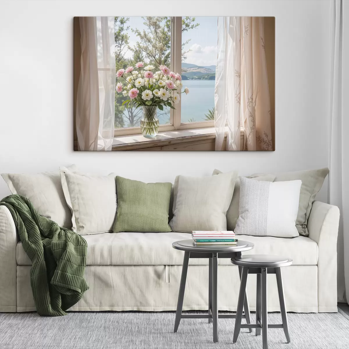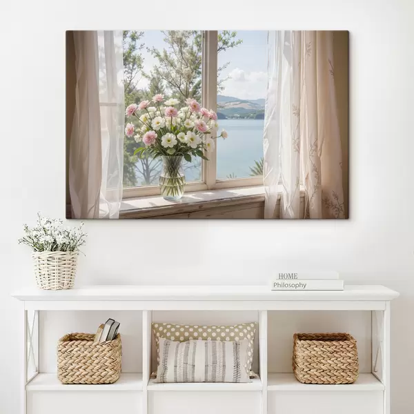 Paveikslas Rožinių ir baltų gėlių puokštė stiklinėje vazoje ant palangės su vaizdingu ežeru ir kalnais Nr s40151