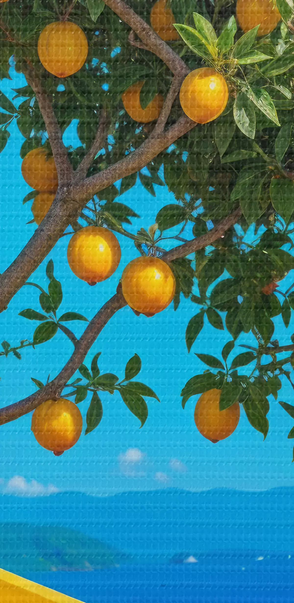 Paveikslas Apelsinmedis su prinokusiais vaisiais auga ant pastato su mėlyna siena ir čerpiniu stogu su vaizdu į vandenyną Nr s40159