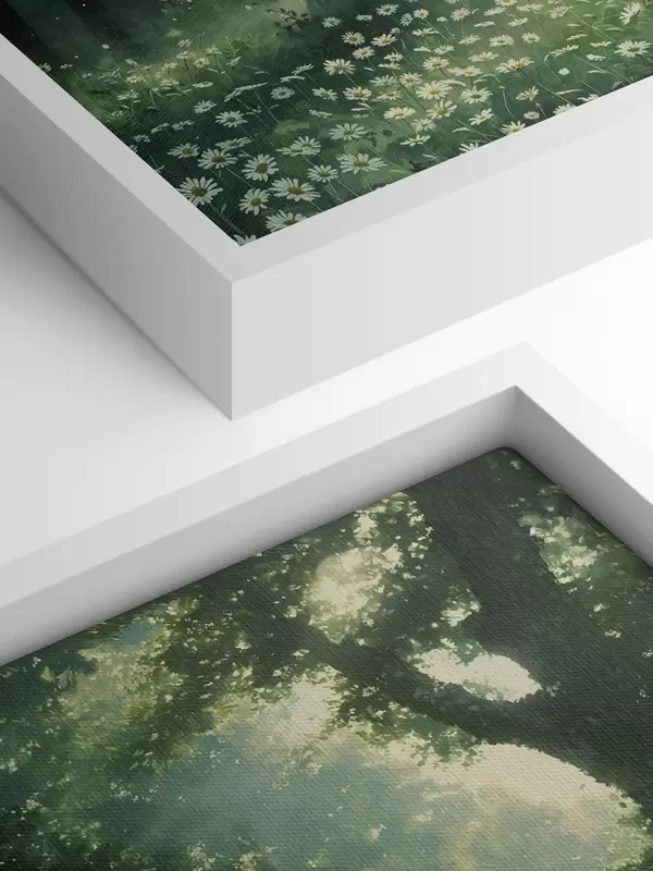 Paveikslas Tankus miškas su saulės spinduliais medžiuose, ramunėlių žiedais, žalia žole, gamta Nr s40224