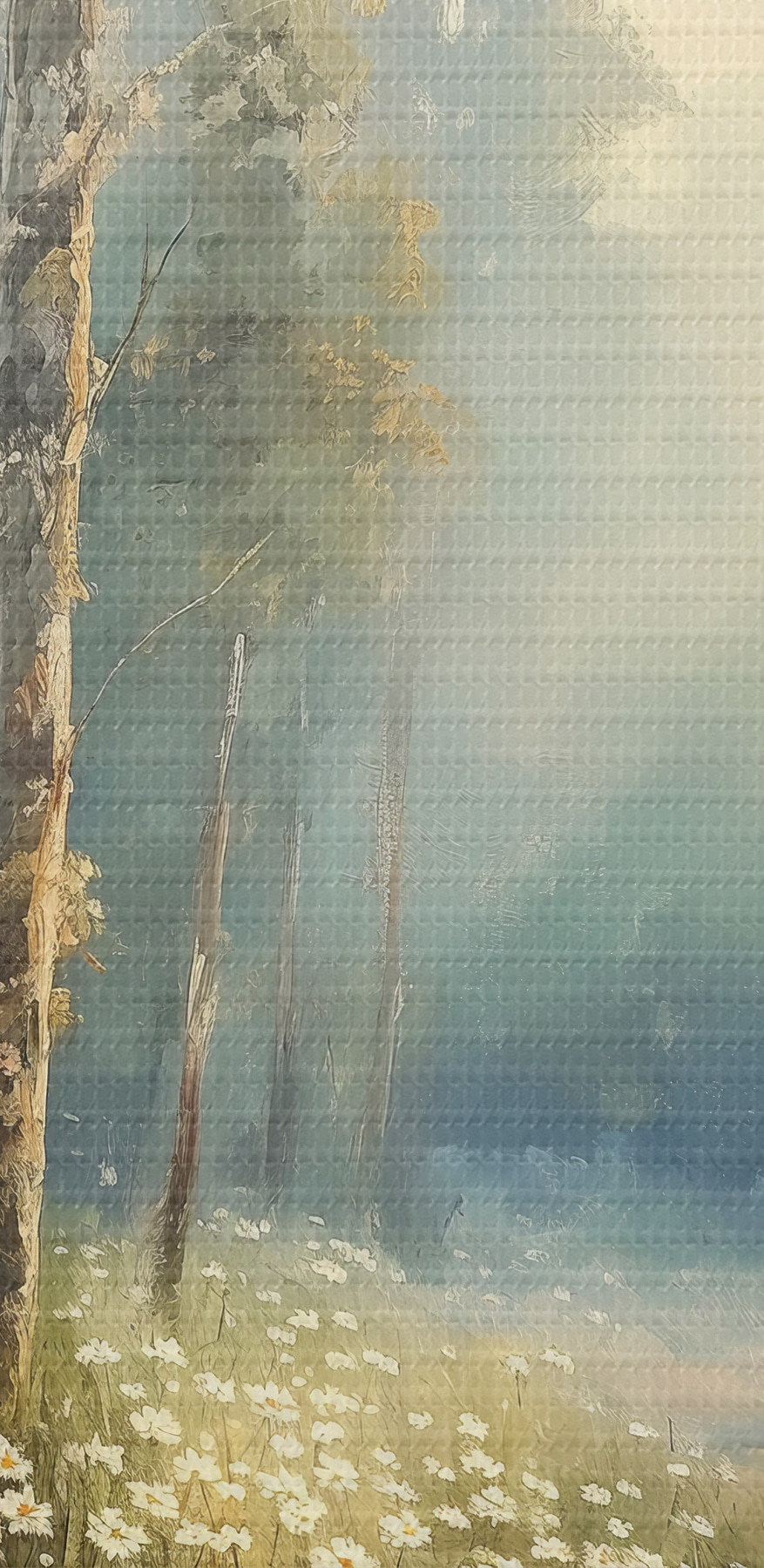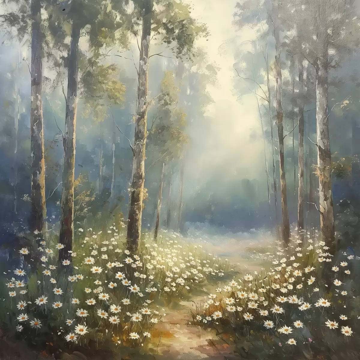 Paveikslas Miškas su beržais ir ramunėlių žiedais, švelni saulės šviesa, natūralios spalvos, pastelinė Nr s40225