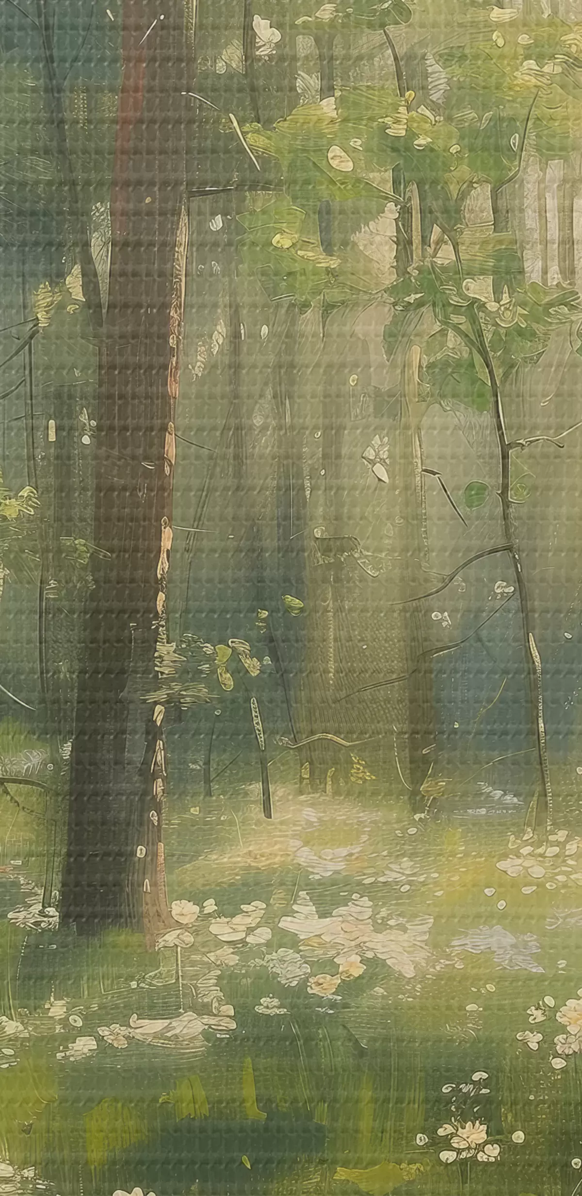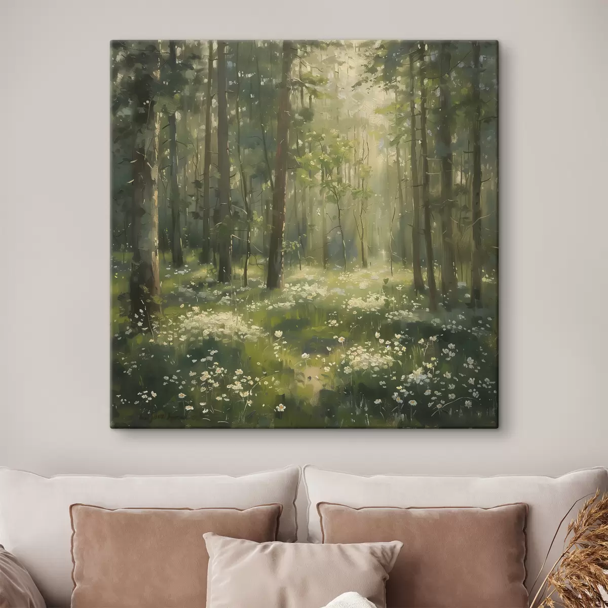 Paveikslas Miškas su saulės šviesa medžiuose, ramunėlių gėlėmis, žalia žolė, akrilo piešinys Nr s40226