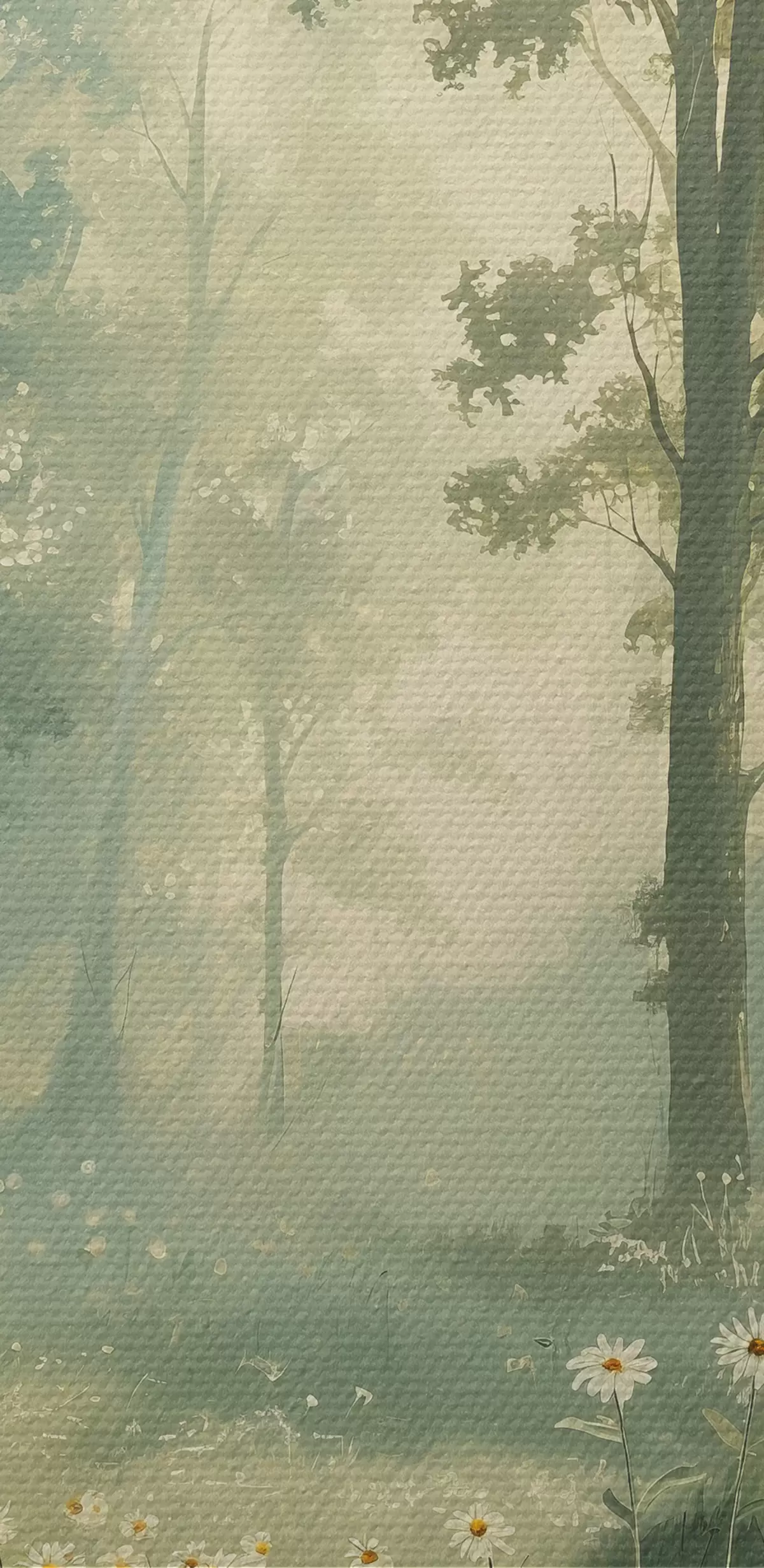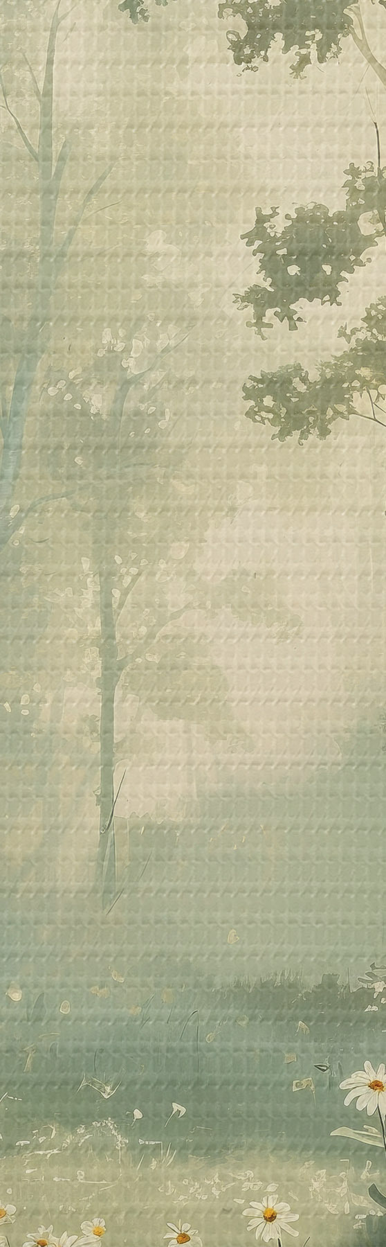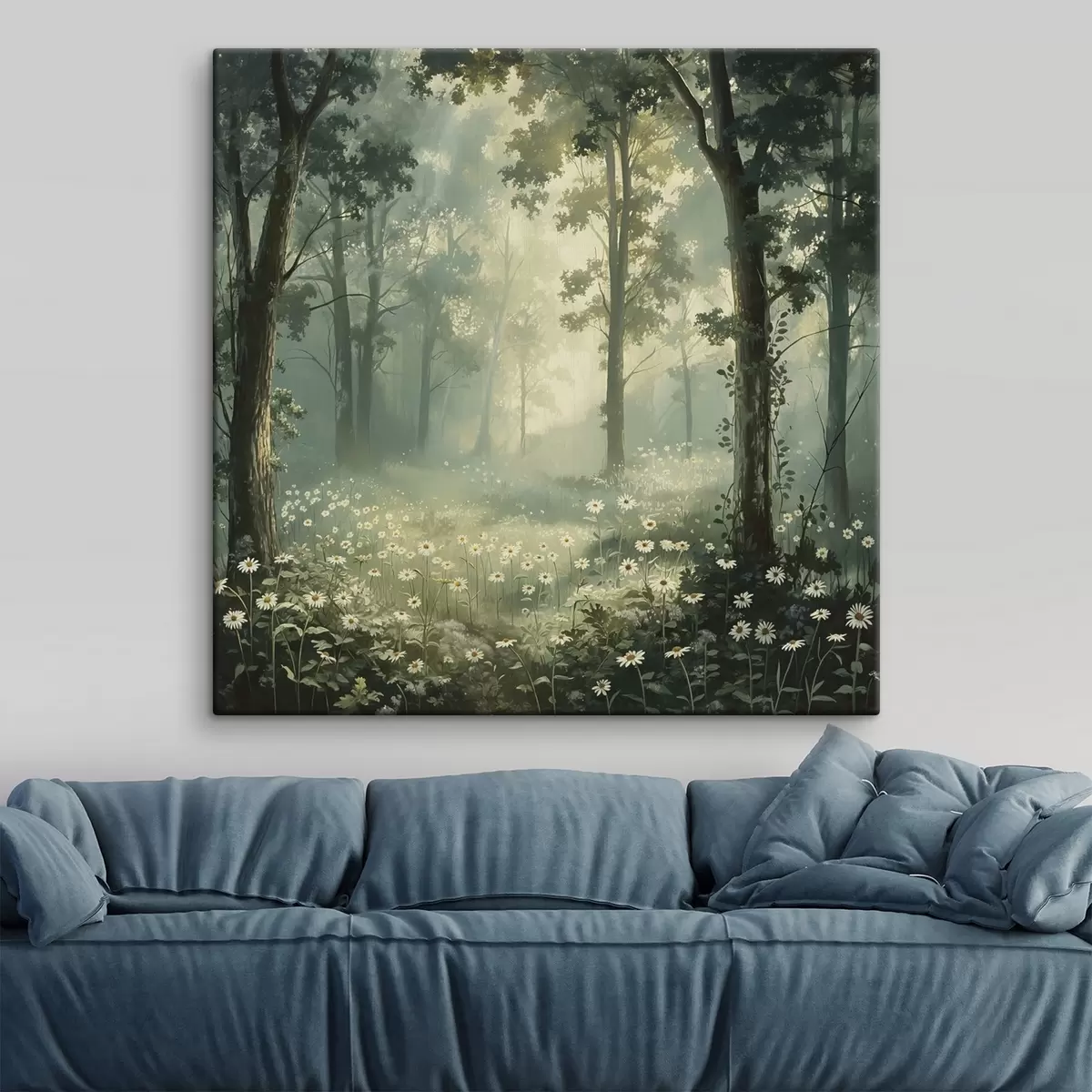 Paveikslas Miškas su švelnia saulės šviesa, ramunėlių gėlėmis, medžiais, žalia žolė, akrilo piešinys Nr s40228