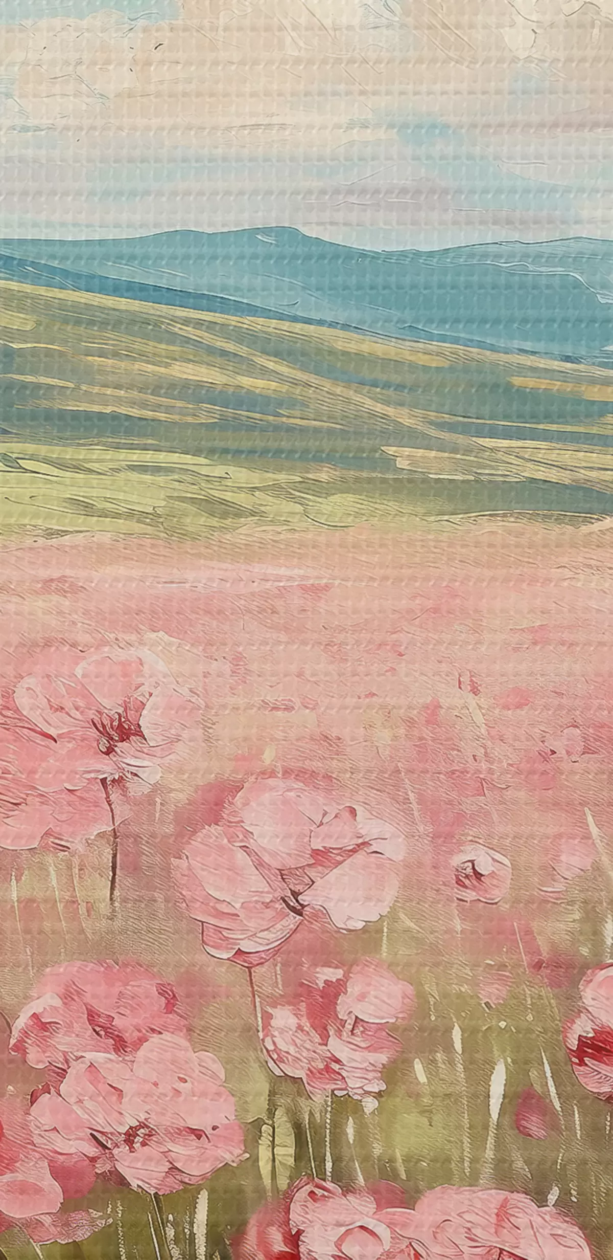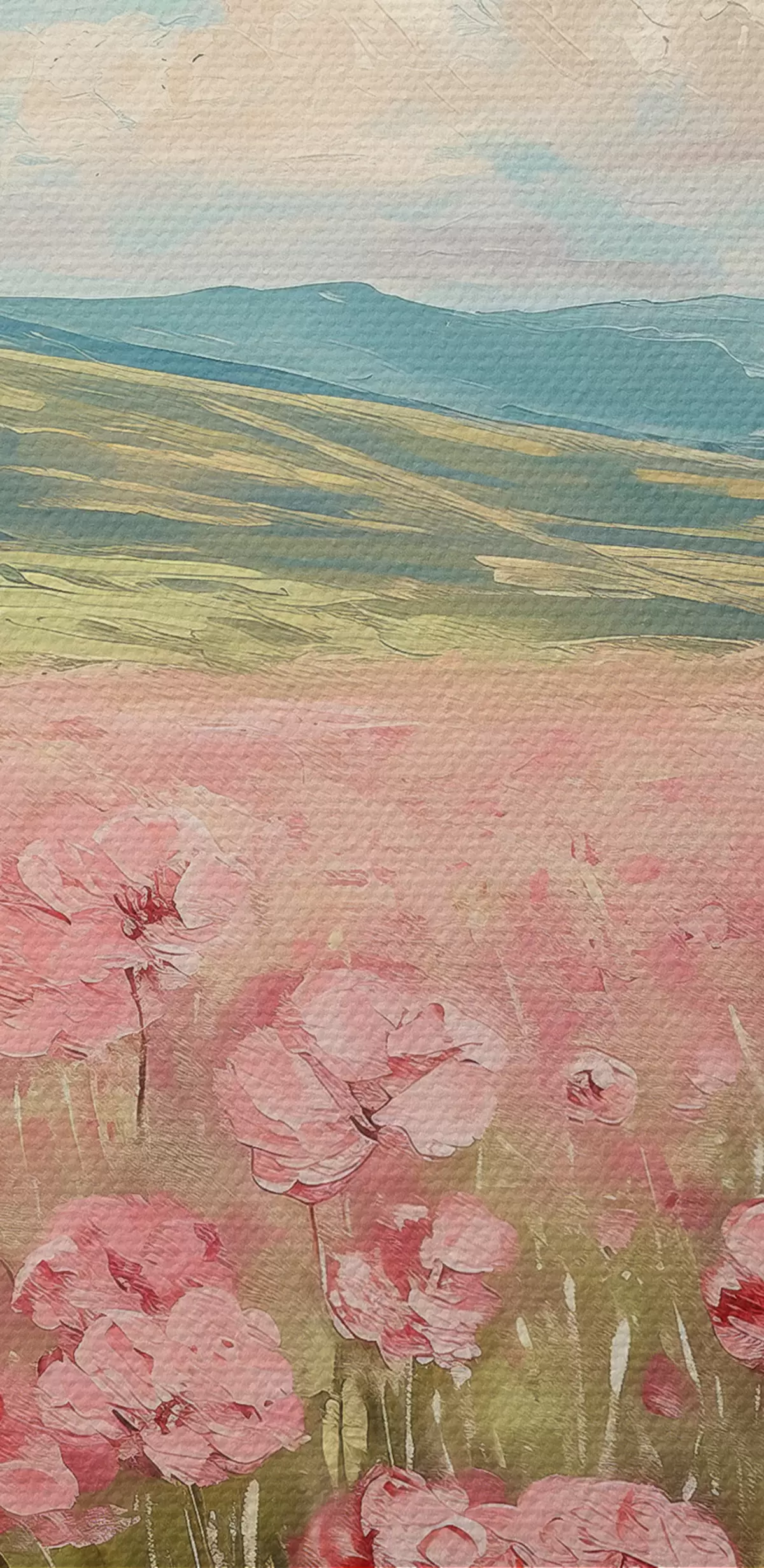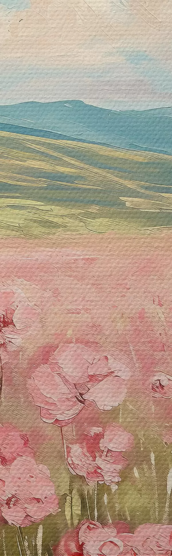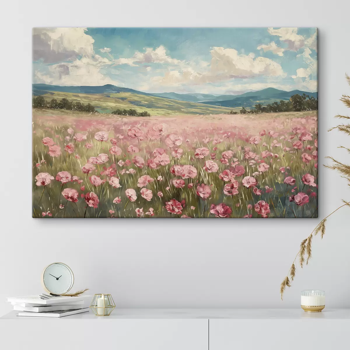 Paveikslas Pieva su rožinėmis gėlėmis, kalnai, gamtos peizažas, mėlynas dangus su debesimis, akrilas Nr s40232