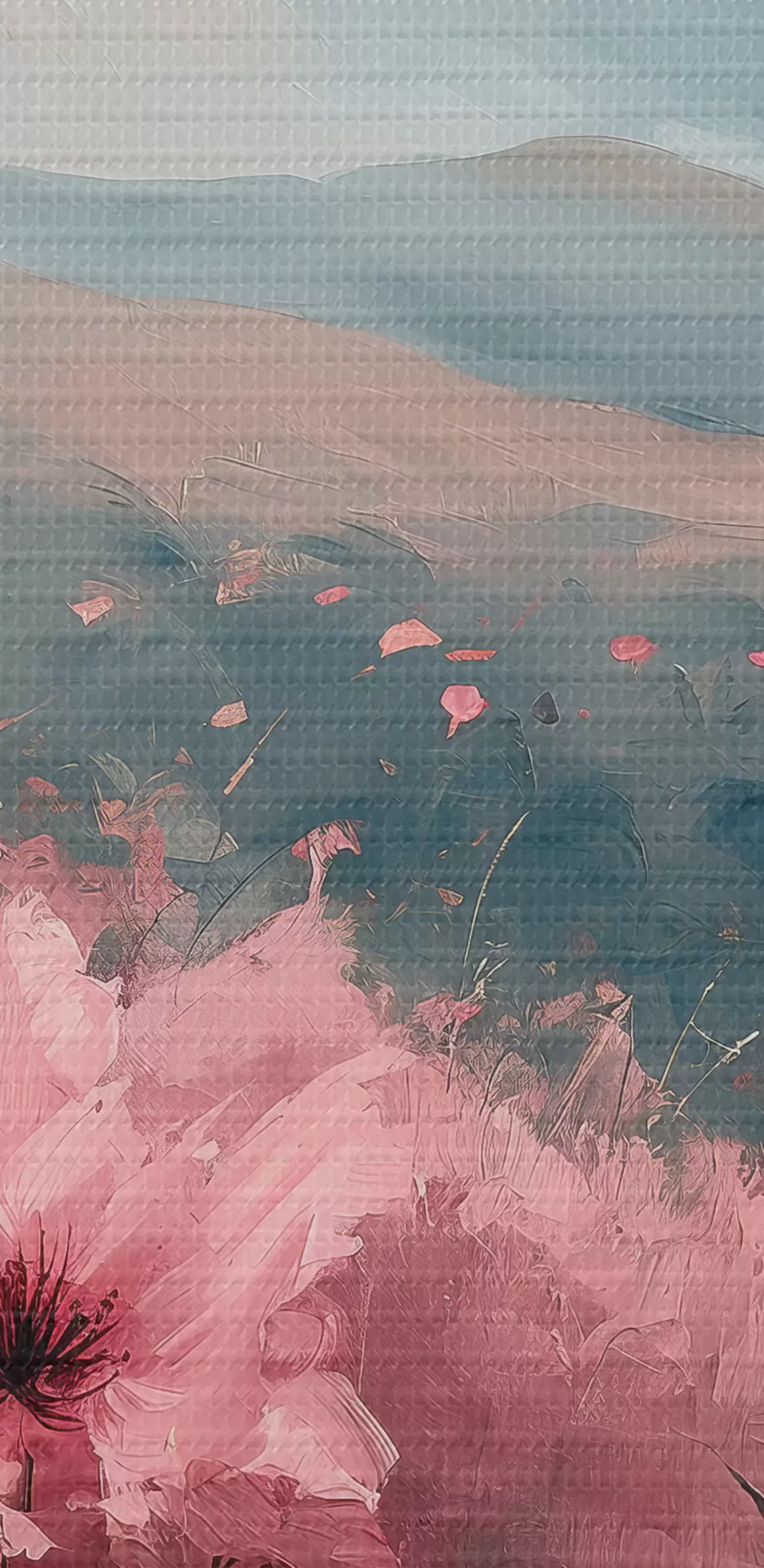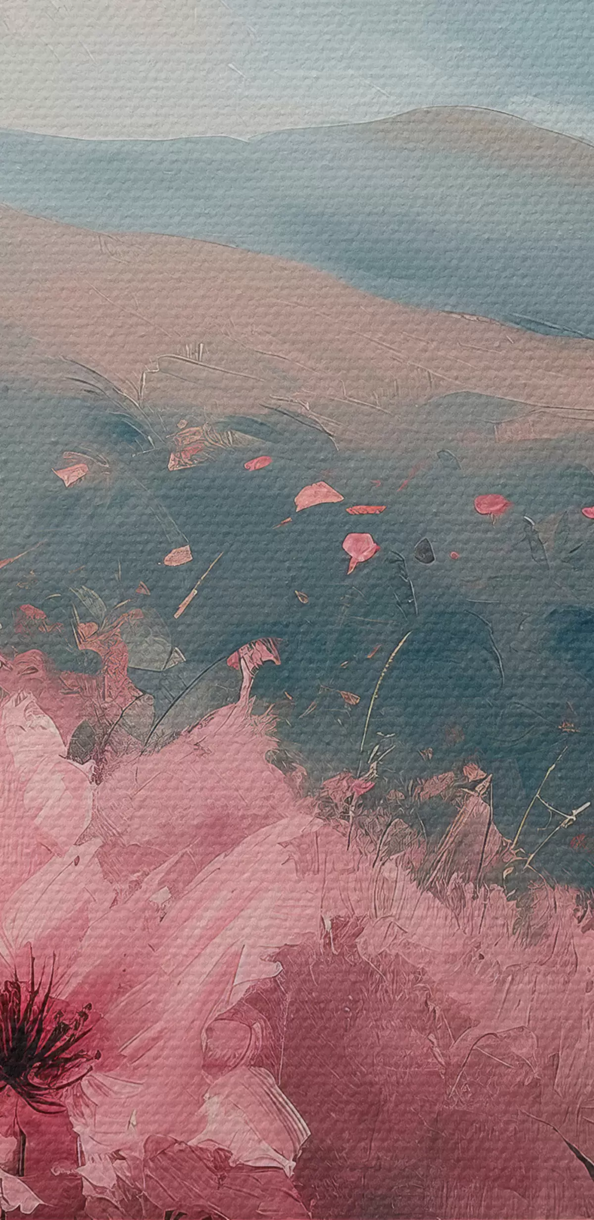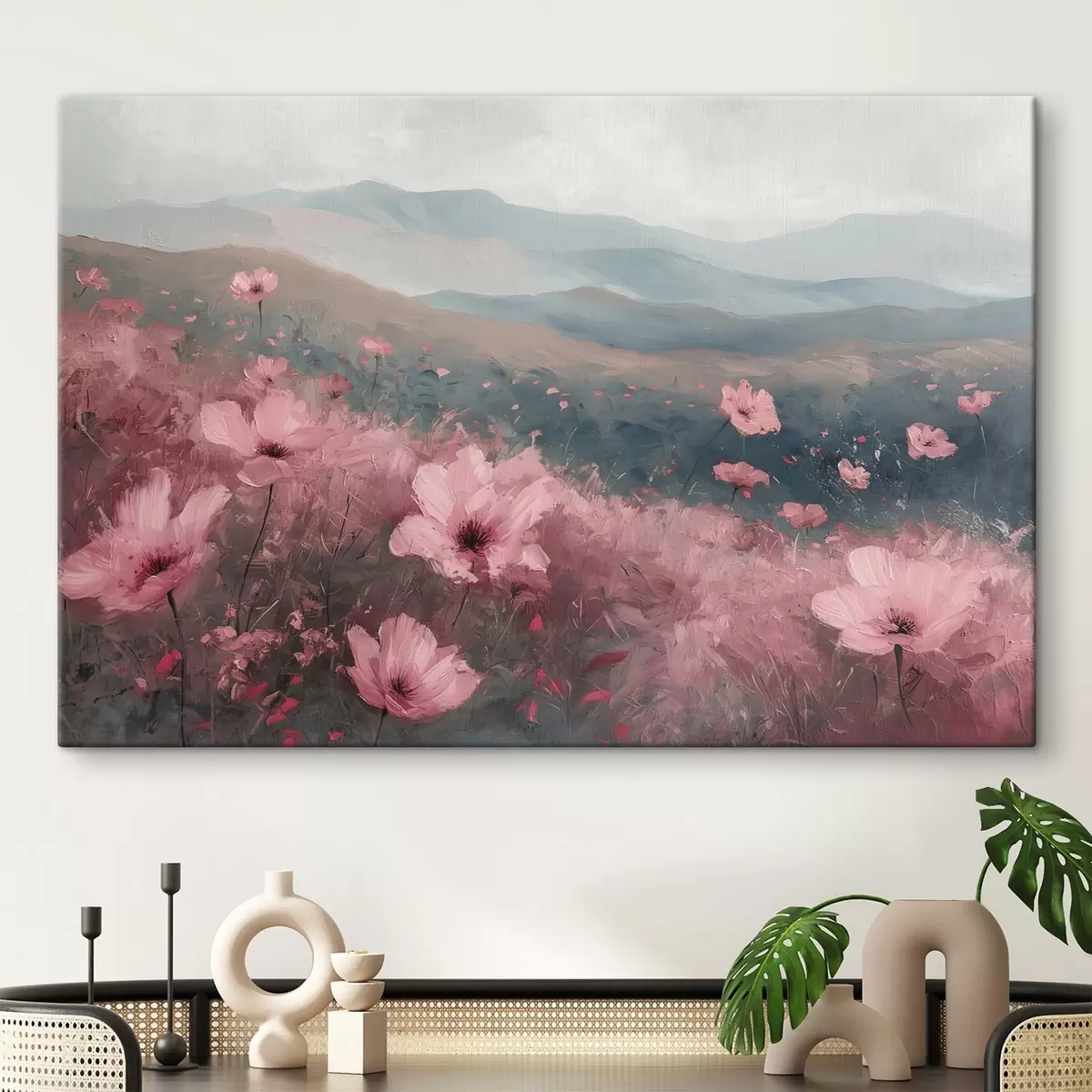 Paveikslas Rožinės gėlės pievoje, gamtos peizažas, kalnai, aliejinė tapyba, ryškūs potėpiai Nr s40233