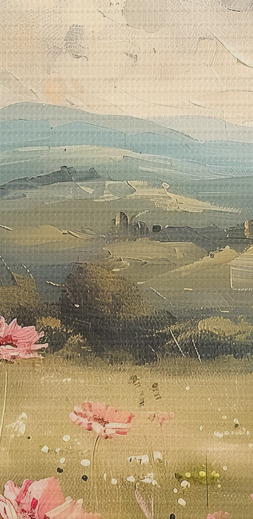 Paveikslas Pieva su rožinėmis gėlėmis, žalia žolė, gamtos peizažas, dangus su debesimis, akrilo piešinys Nr s40234