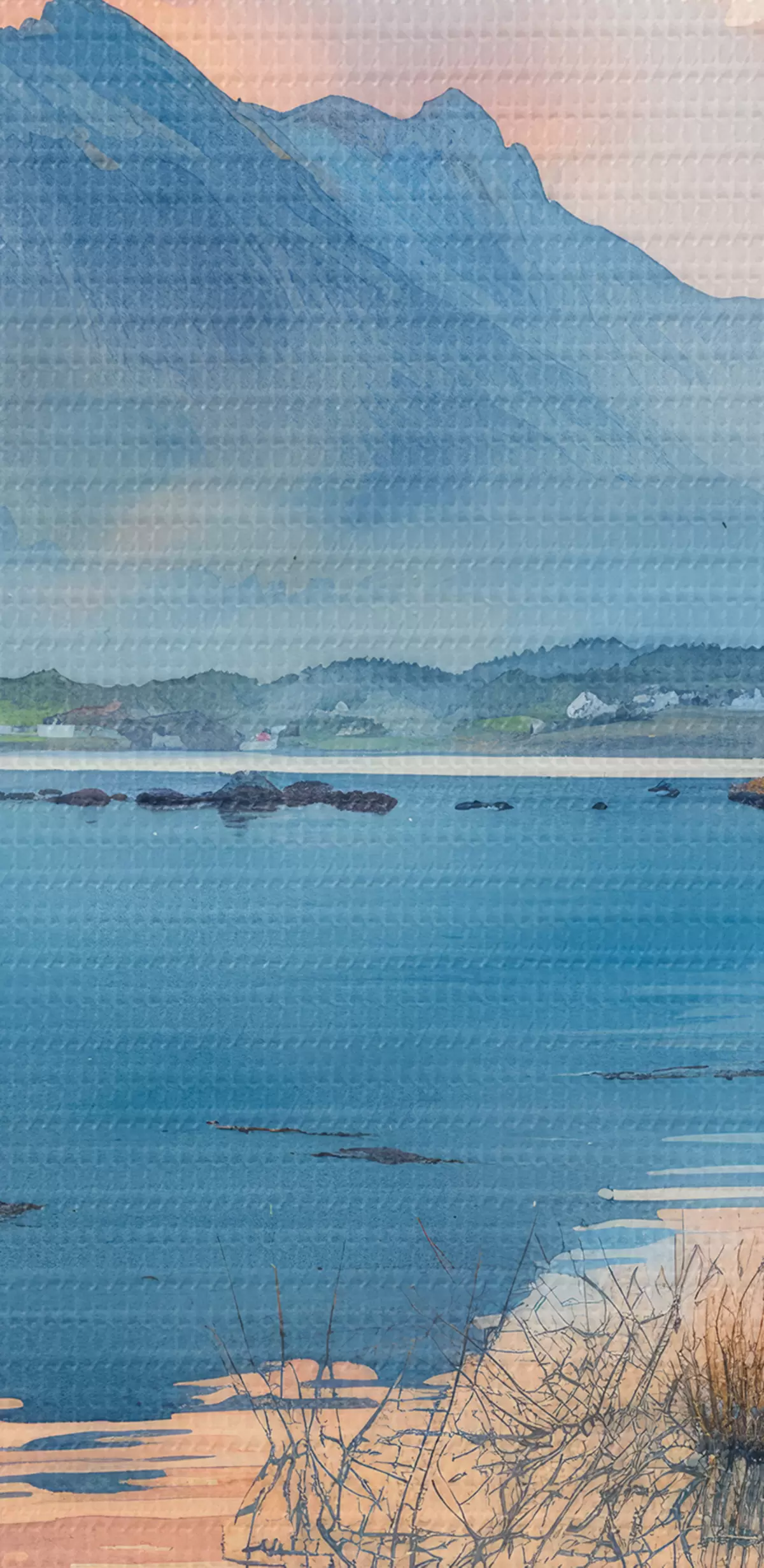 Paveikslas Rami upė su kalnais, saulėtekis, švelnios spalvos Nr s40307