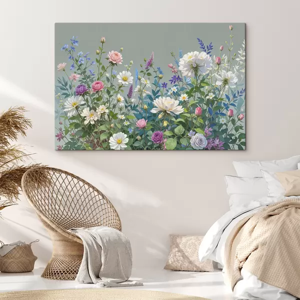 Paveikslas Vešlus, gyvybingas sodas, pilnas įvairių spalvingų gėlių ir žydinčių augalų pilkame fone Nr s40393