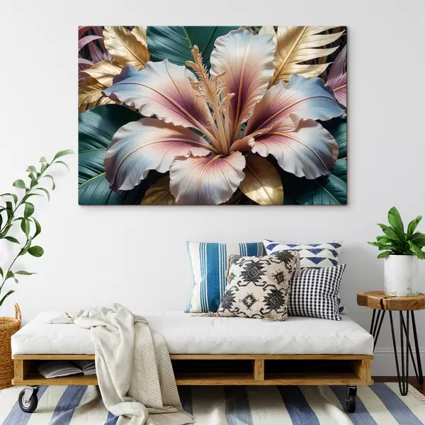 Paveikslas Ryški, įvairiaspalvė atogrąžų hibisko gėlė su dideliais, įmantriais rožinių, baltų ir geltonų atspalvių žiedlapiais Nr s40399
