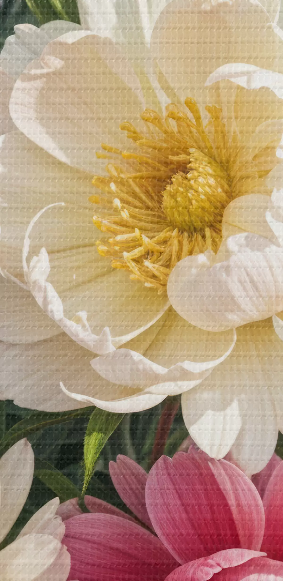 Paveikslas Įvairių rožinių, baltų ir geltonų atspalvių su dažų purslais ryškių bijūnų gėlių puokštė Nr s40403