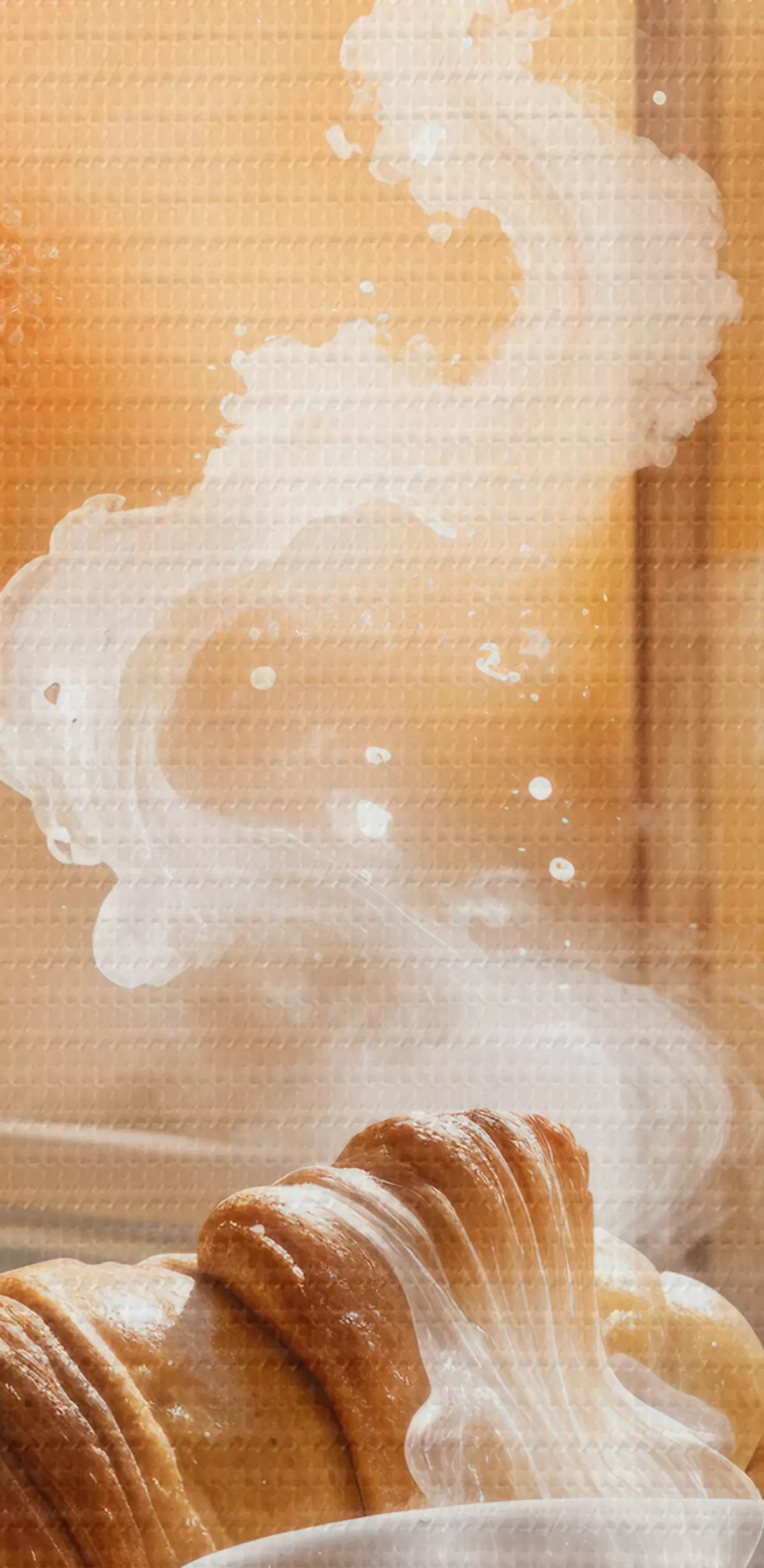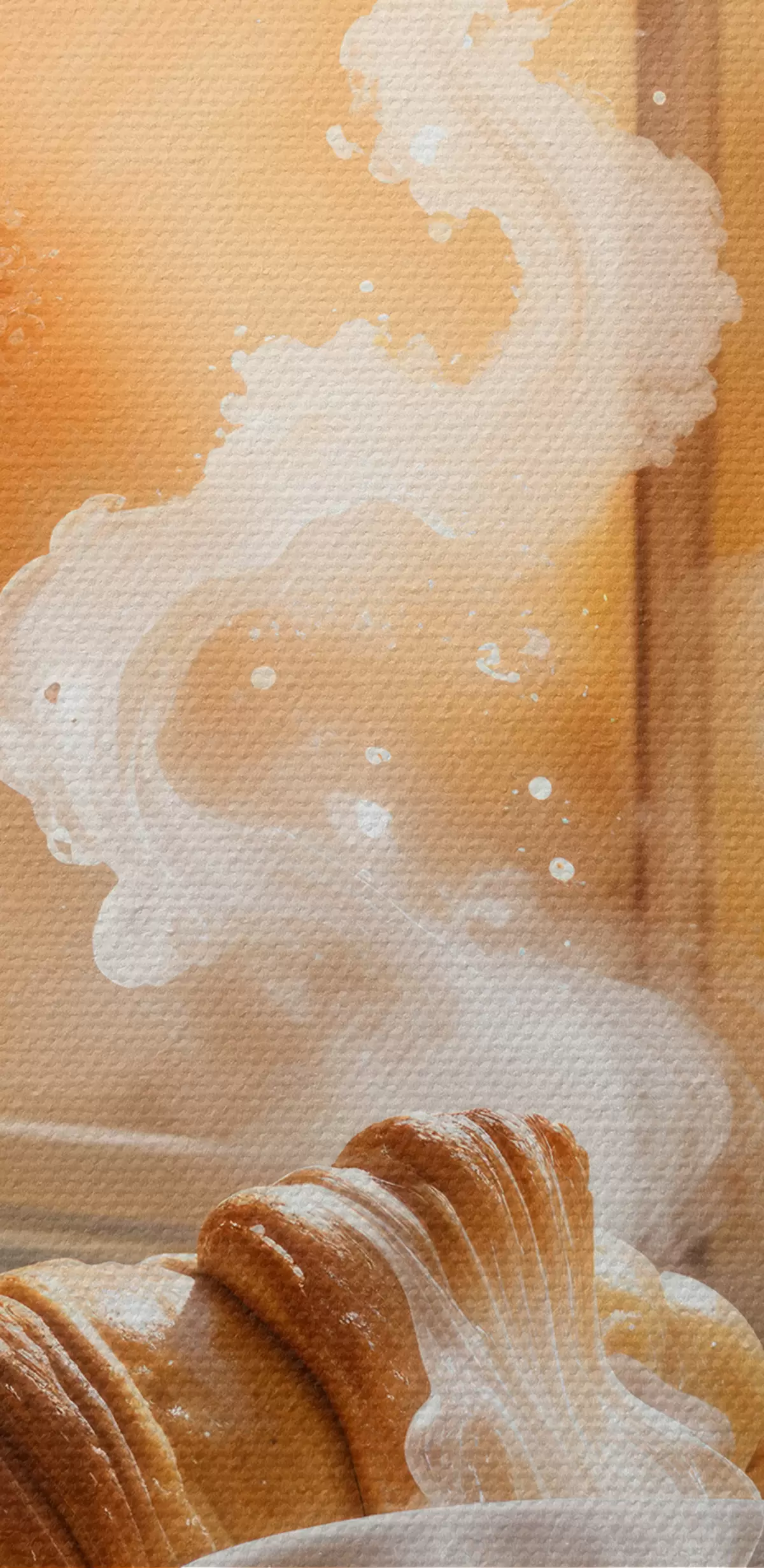 Paveikslas Šiltas kavos puodelis su kylančiais garais, padėtas ant stalo šalia kruasano, su vaizdu į istorinį pastatą Nr s40405
