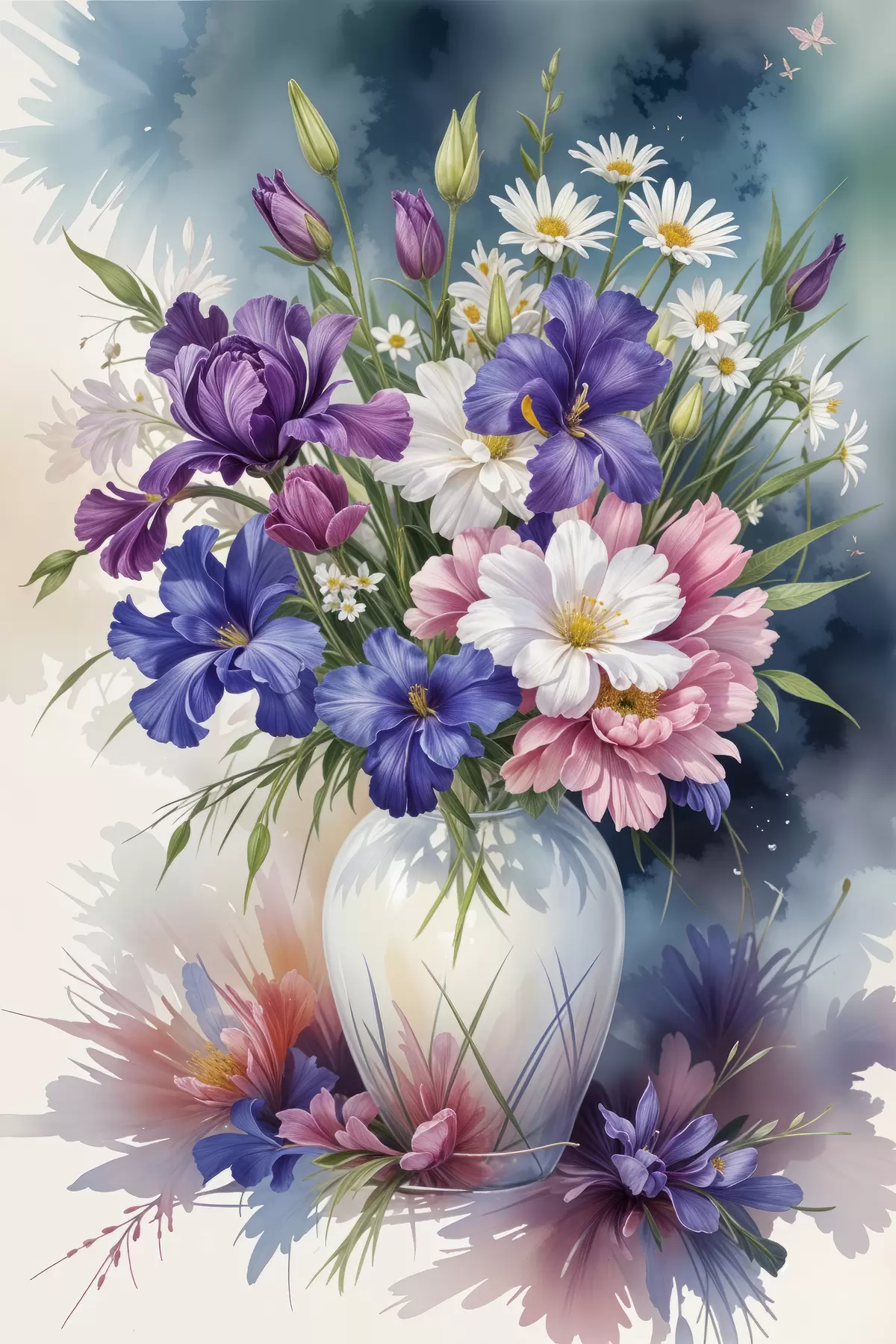 Paveikslas Ryški spalvingų violetinių vilkdalgių, rožinių ramunėlių ir kitų žiedų puokštė, išdėstyta baltoje vazoje Nr s40407