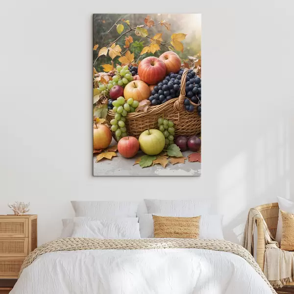 Paveikslas Krepšelis, pripildytas įvairių rudens vaisių, įskaitant obuolius, vynuoges ir kriaušes, apsuptas nukritusių lapų Nr s40409