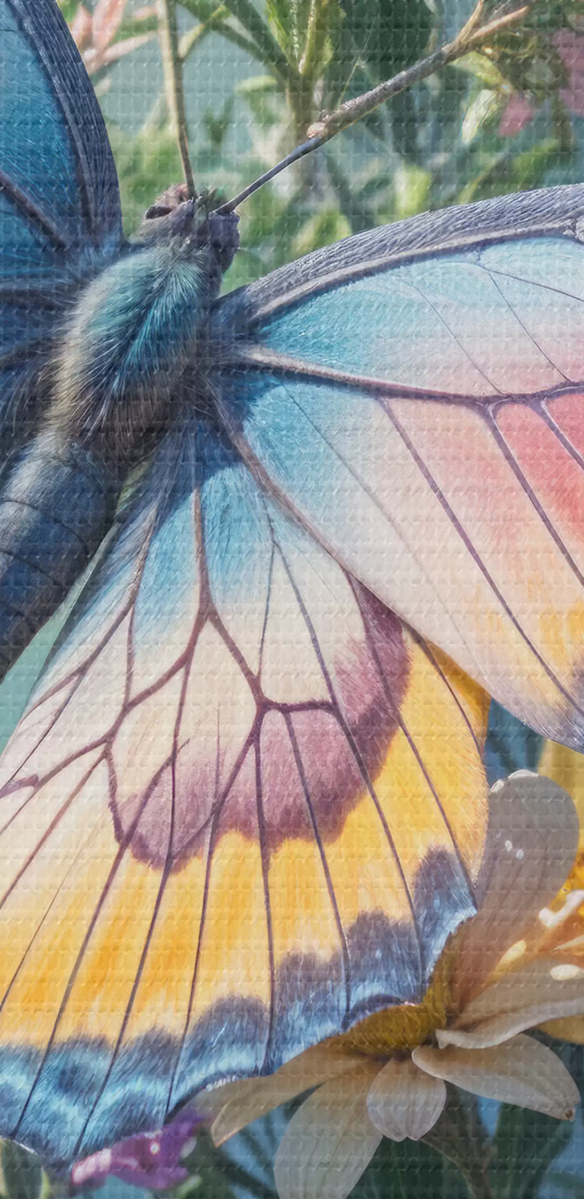 Paveikslas Didelis, spalvingas drugelis, tupintis ant rožinių ir geltonų gėlių puokštės tamsiai žaliame fone Nr s40411