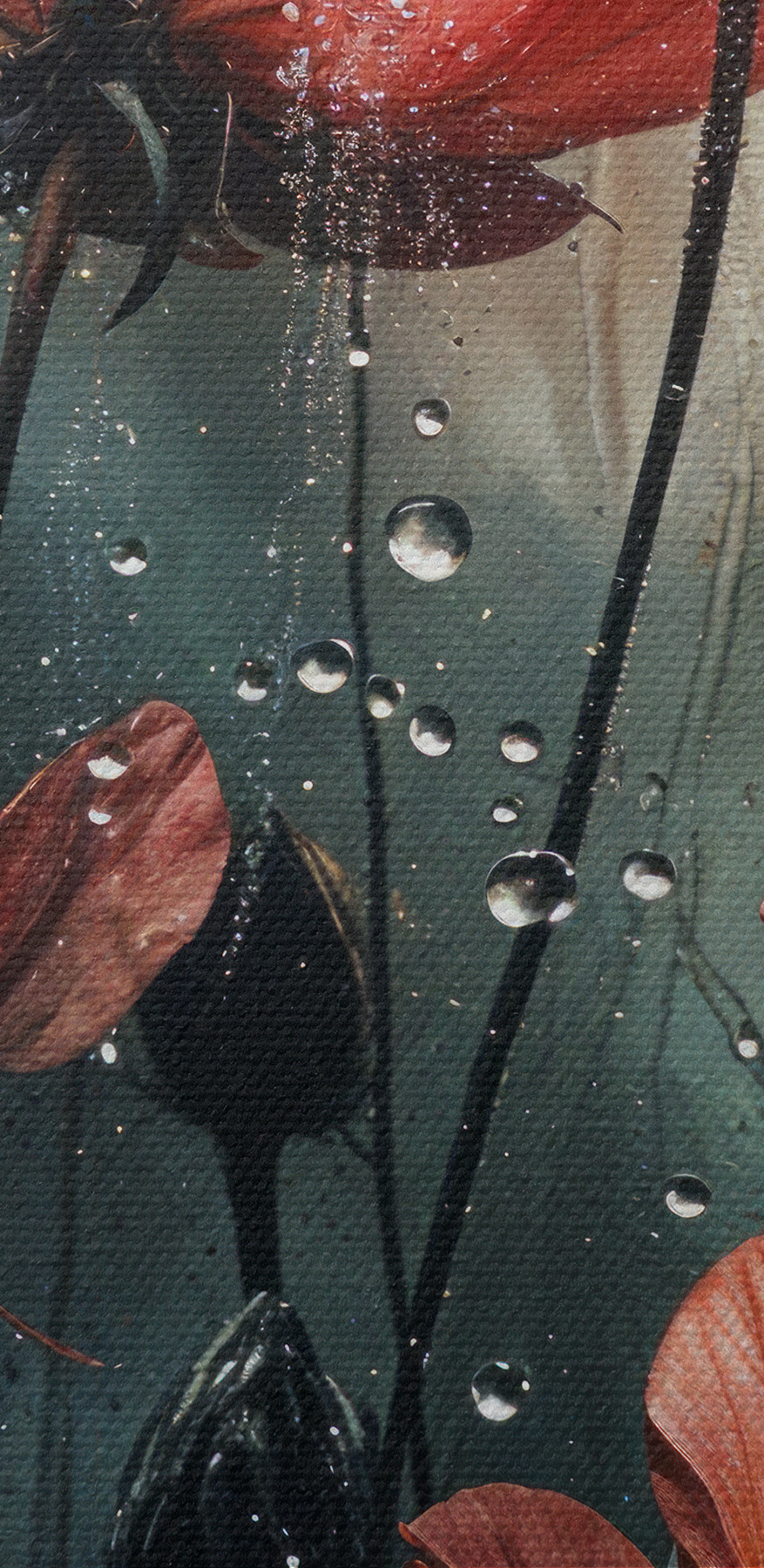 Paveikslas Raudonos gėlės su vandens lašeliais neryškiame fone Nr s40412