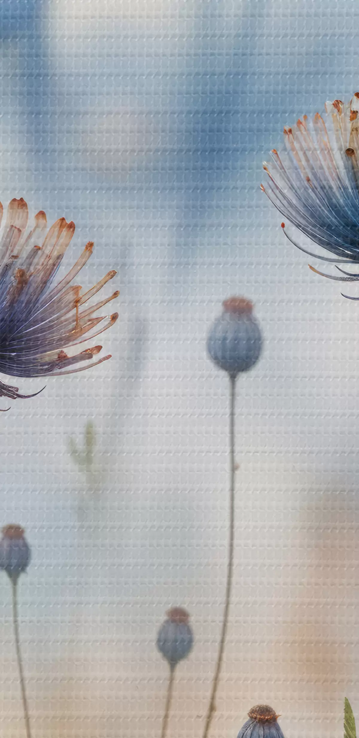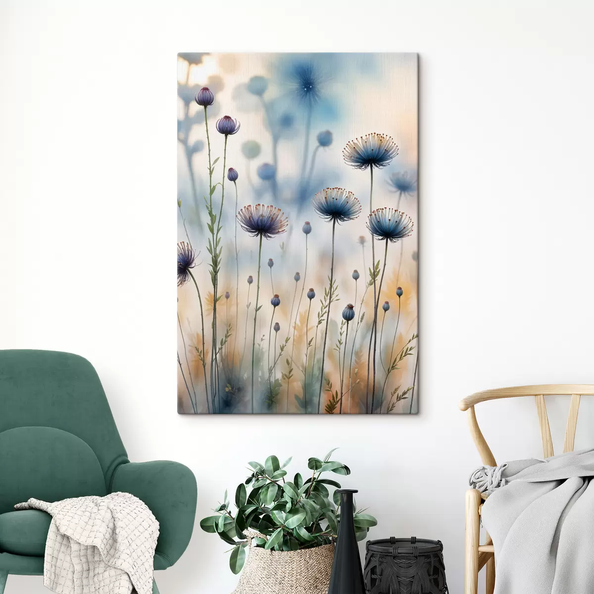 Paveikslas Aukštos violetinės, į kiaulpienę panašios gėlės su neryškiu fonu, sukuriančios ramią ir svajingą atmosferą Nr s40414