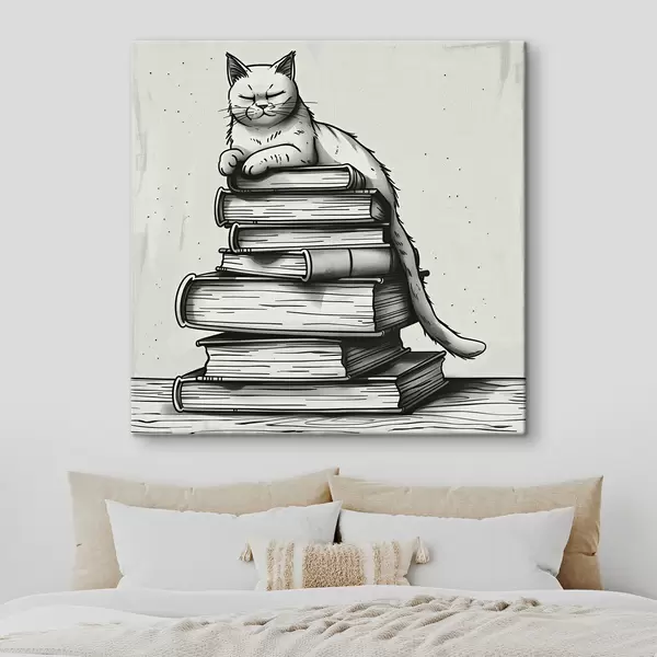 Paveikslas Juoda ir balta katė ant knygų krūvos Nr s40435