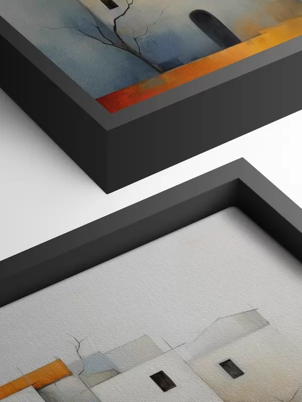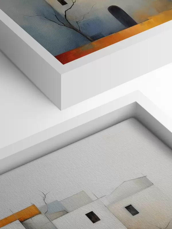 Paveikslas Baltai stilizuoti namai abstrakčiai, raudona, oranžinė, geltona, mėlyna spalva Nr s40531