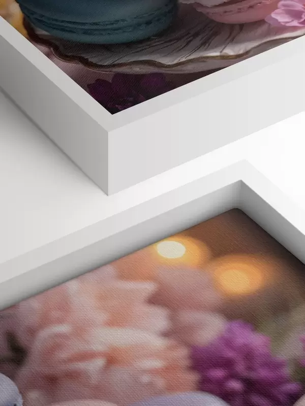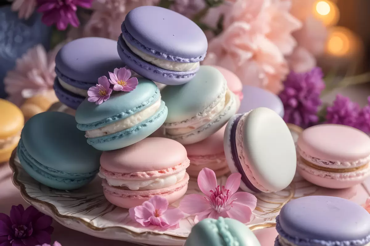 Paveikslas Spalvingi macarons su rožinėmis ir violetinėmis gėlėmis lėkštėje, iš arti Nr s40546