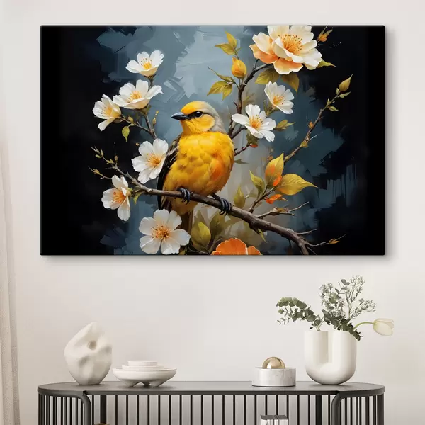 Paveikslas Geltonas paukštis, tupintis ant šakos su baltomis ir oranžinėmis gėlėmis fone Nr s40550