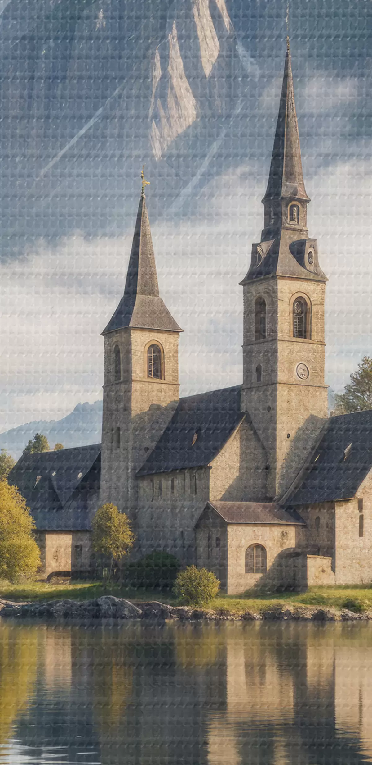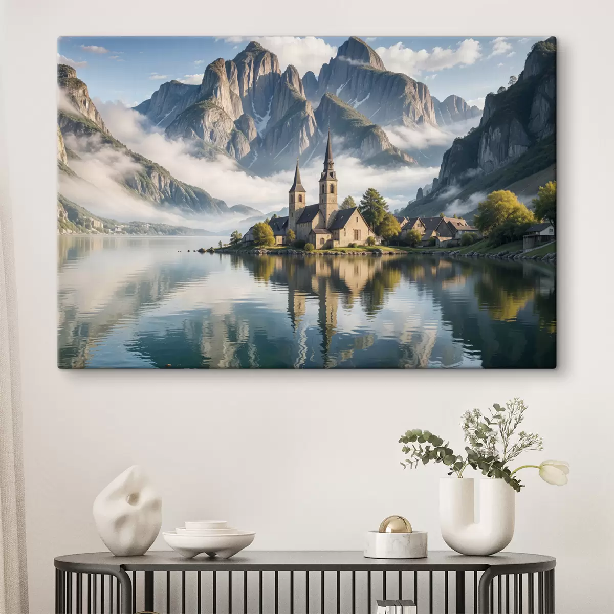 Paveikslas Vaizdingas Alpių kaimas, esantis prie ramaus ežero su aukštais snieguotais kalnais Nr s40554