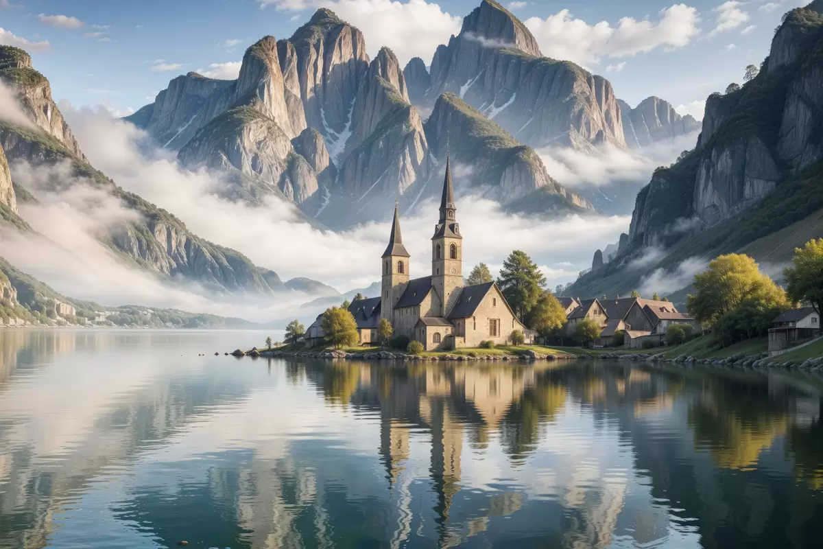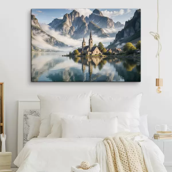 Paveikslas Vaizdingas Alpių kaimas, esantis prie ramaus ežero su aukštais snieguotais kalnais Nr s40554