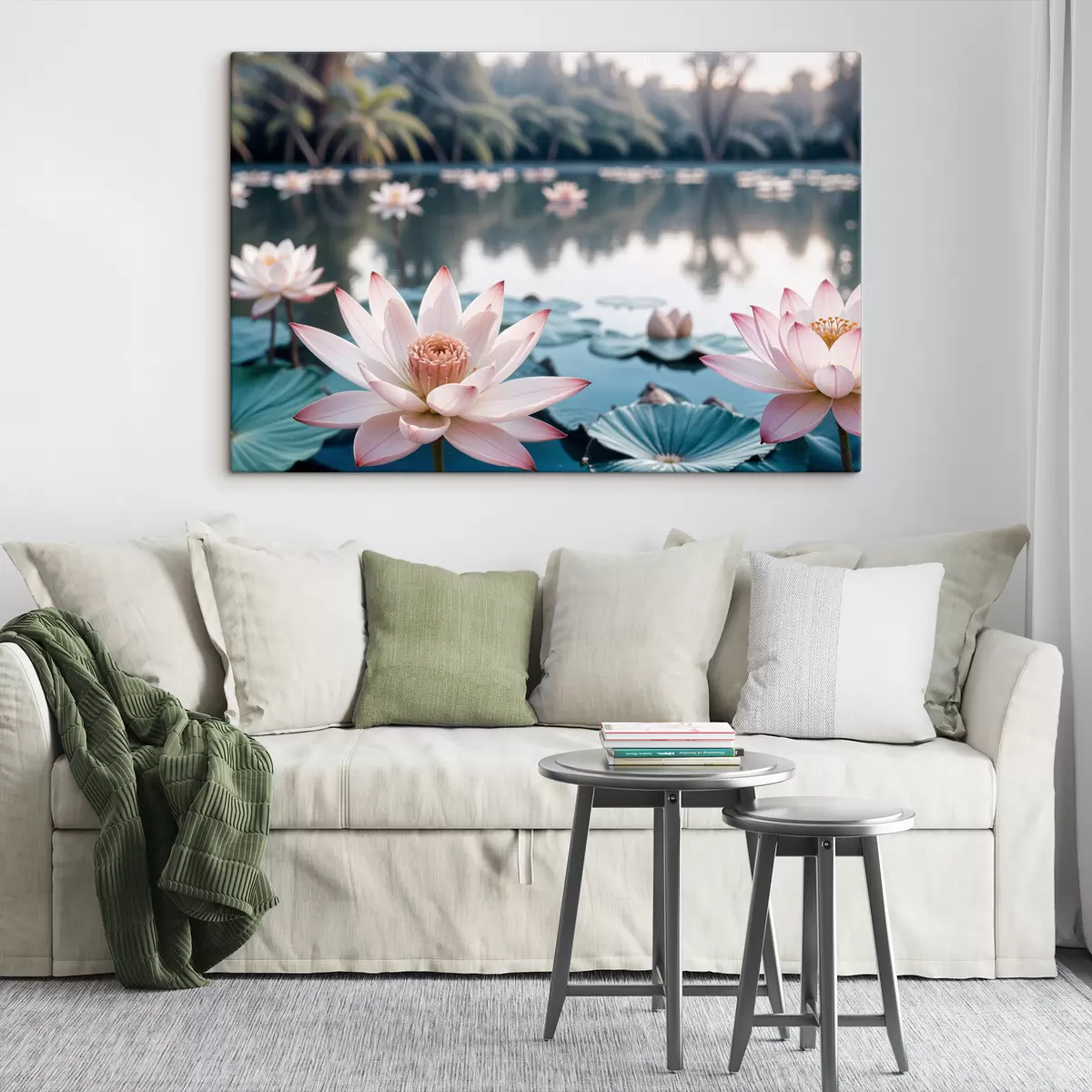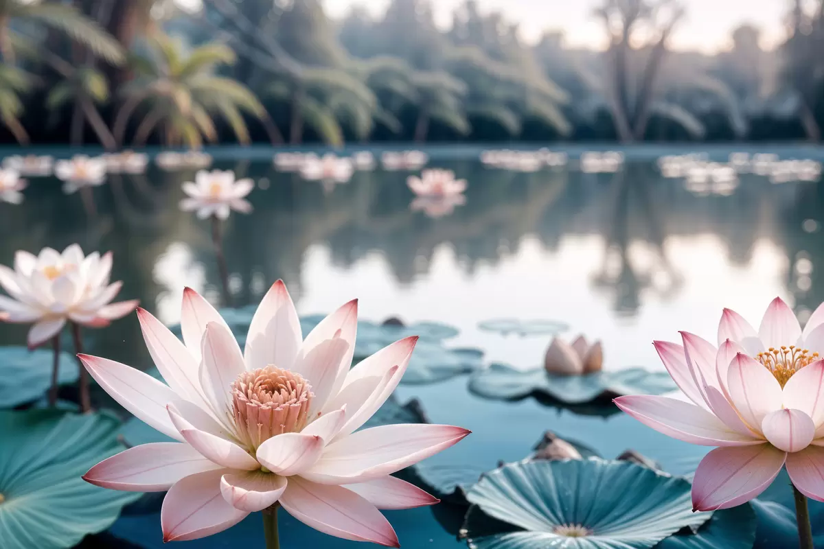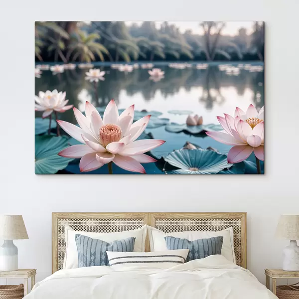 Paveikslas Tvenkinys, kurio paviršiuje plūduriuoja rožinės spalvos lotoso žiedai, apsuptas vešlios žalumos ir palmių Nr s40555