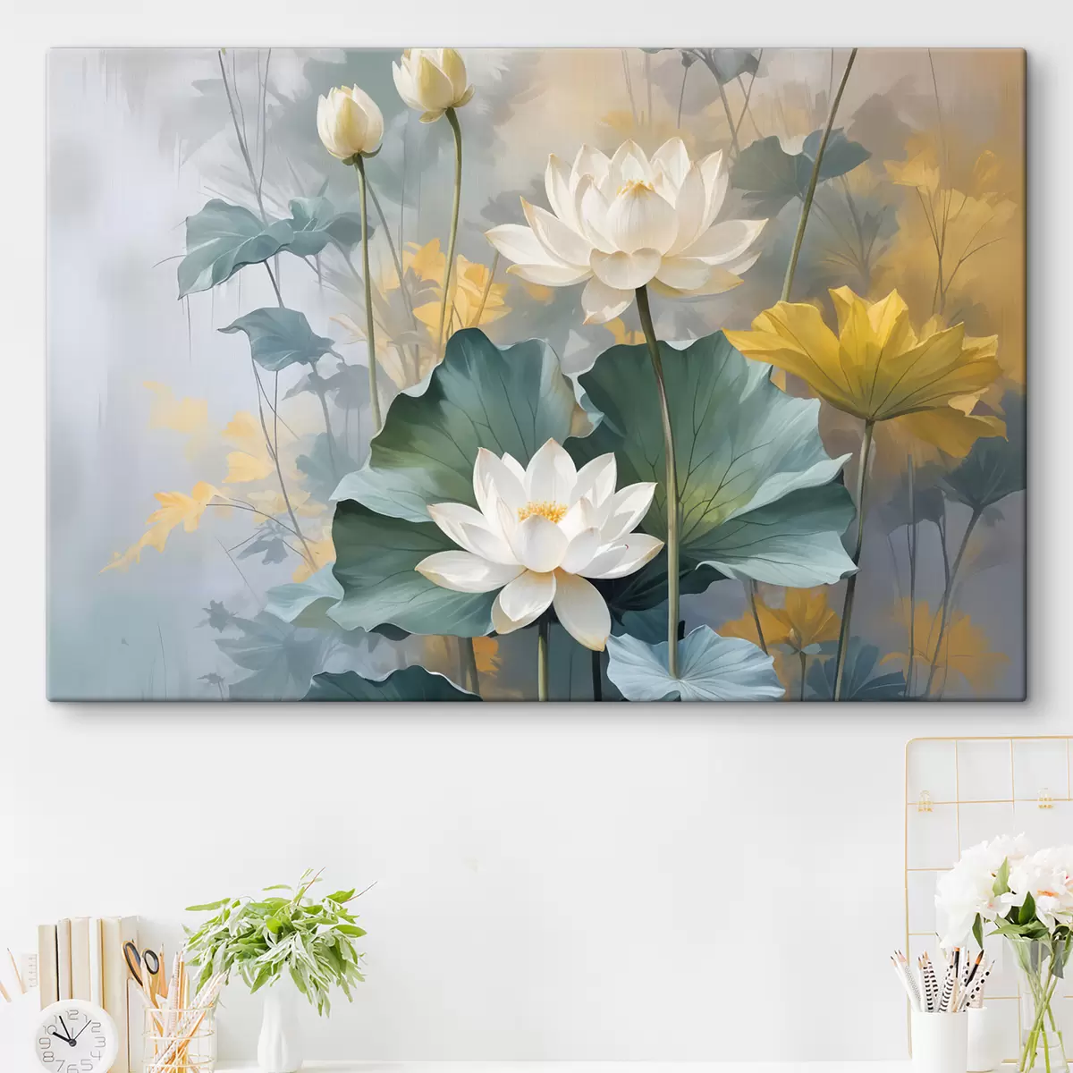Paveikslas Baltos lotoso gėlės tvenkinyje su žaliais lelijų lapeliais, apsuptas geltonų gėlių ir neryškaus fono Nr s40559