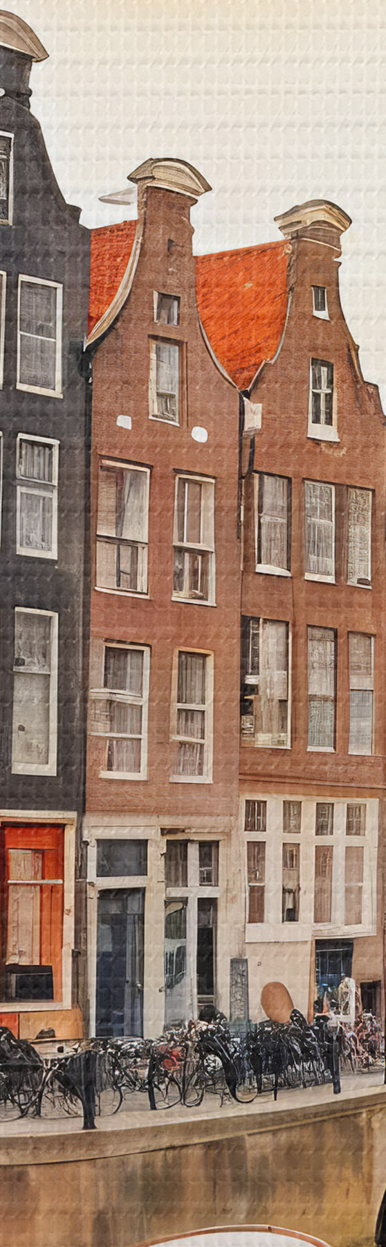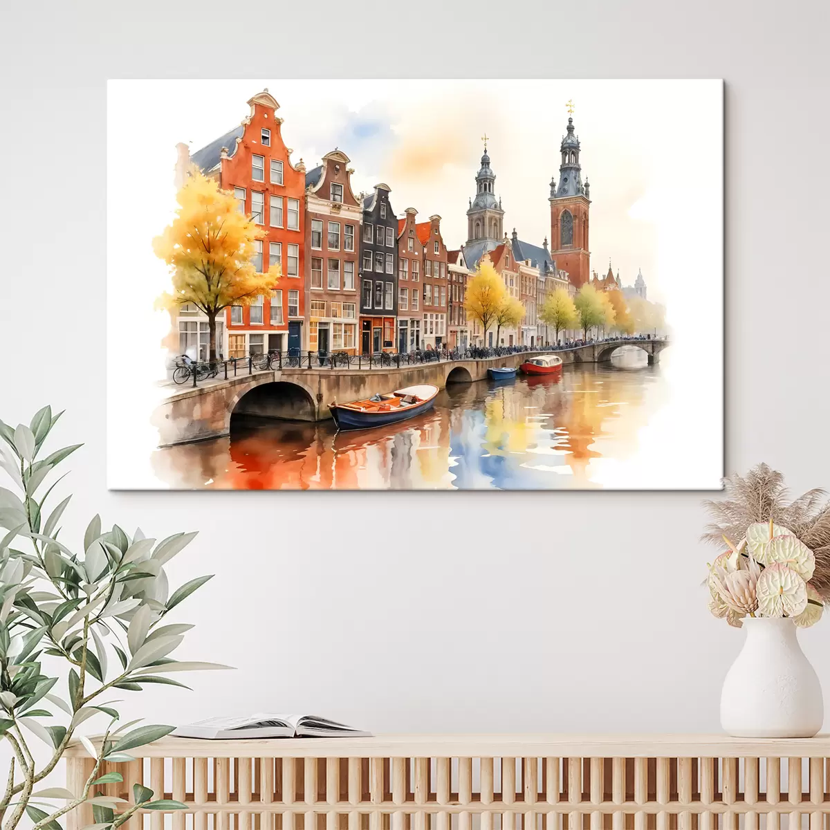 Paveikslas Spalvingas akvarelinis Amsterdamo miesto vaizdas su tradiciniais olandų namais prie kanalo ir valtimis ant vandens Nr s40561