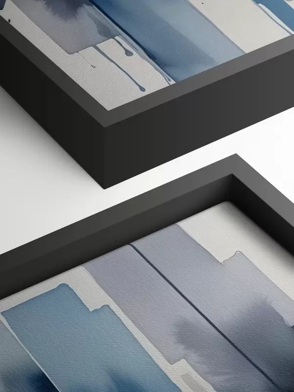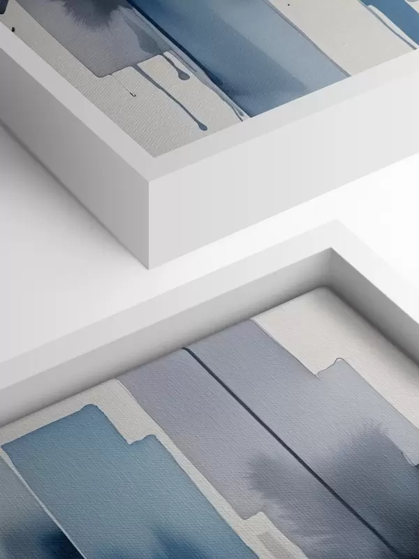 Paveikslas Aukšti, abstraktūs akvarelės potėpiai miglotoje, mėlynų atspalvių kompozicijoje Nr s40564